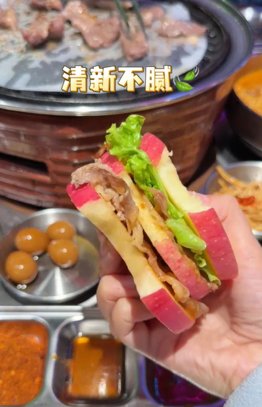 吃过菠萝+烤肉,还没尝过这套组合呢,简直就是“健康版”小汉堡,话说某蜀黍里也卖苹果,能不能就地取材一下~