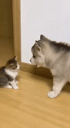 这只狗很有两面性,当面对一只小猫咪时,它表现的很凶,张牙舞爪的,故意吓唬小猫喵,