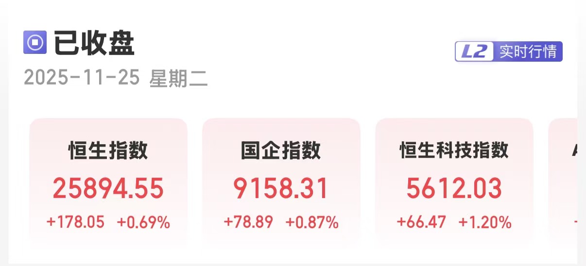 上证报中国证券网讯(卢伊记者严晓菲)11月25日,港股三大指数集体收涨。截至收盘,恒生指数涨0.69%,报25894.55点;恒生国企指数涨0.87%,报9158.31点;恒生科技指数涨1.20%,报5612.03点。