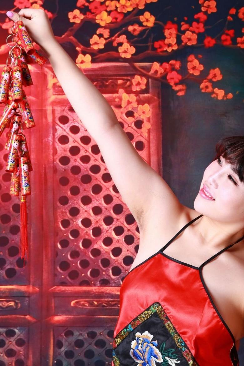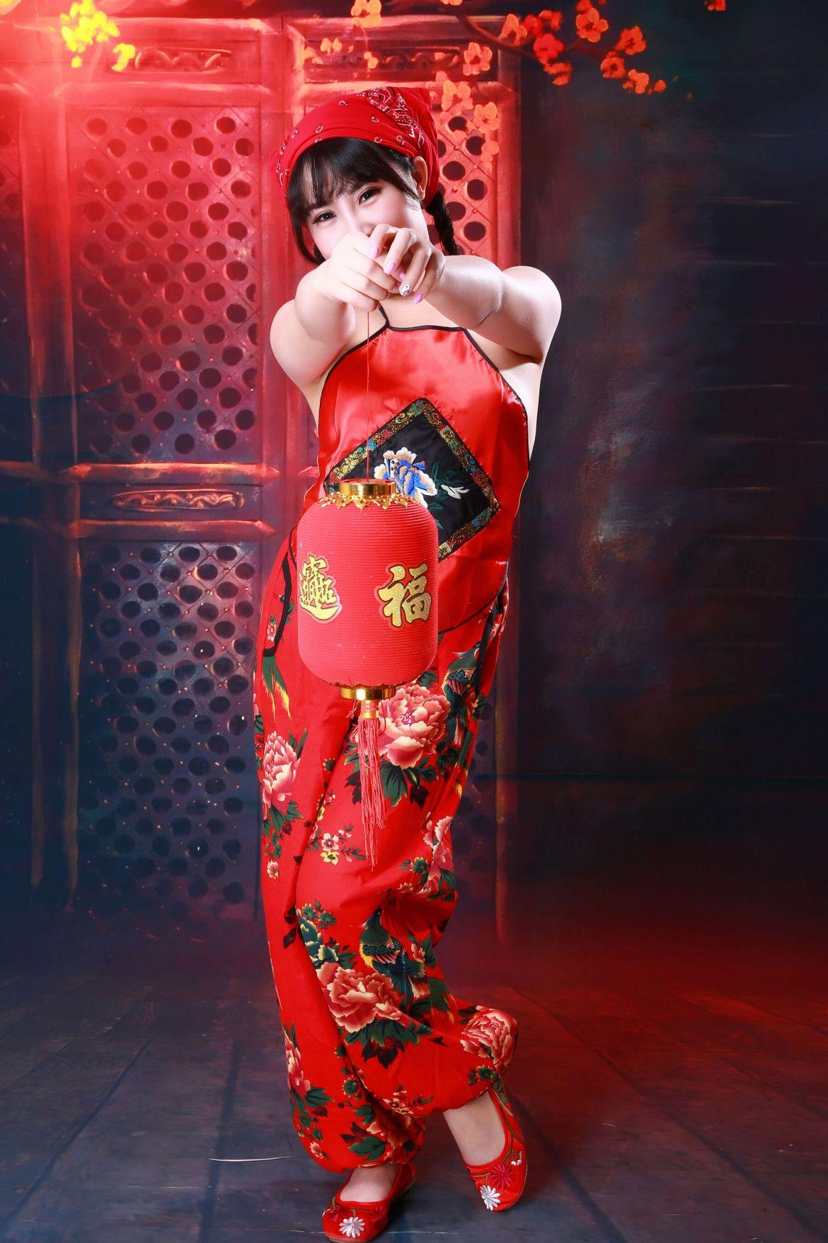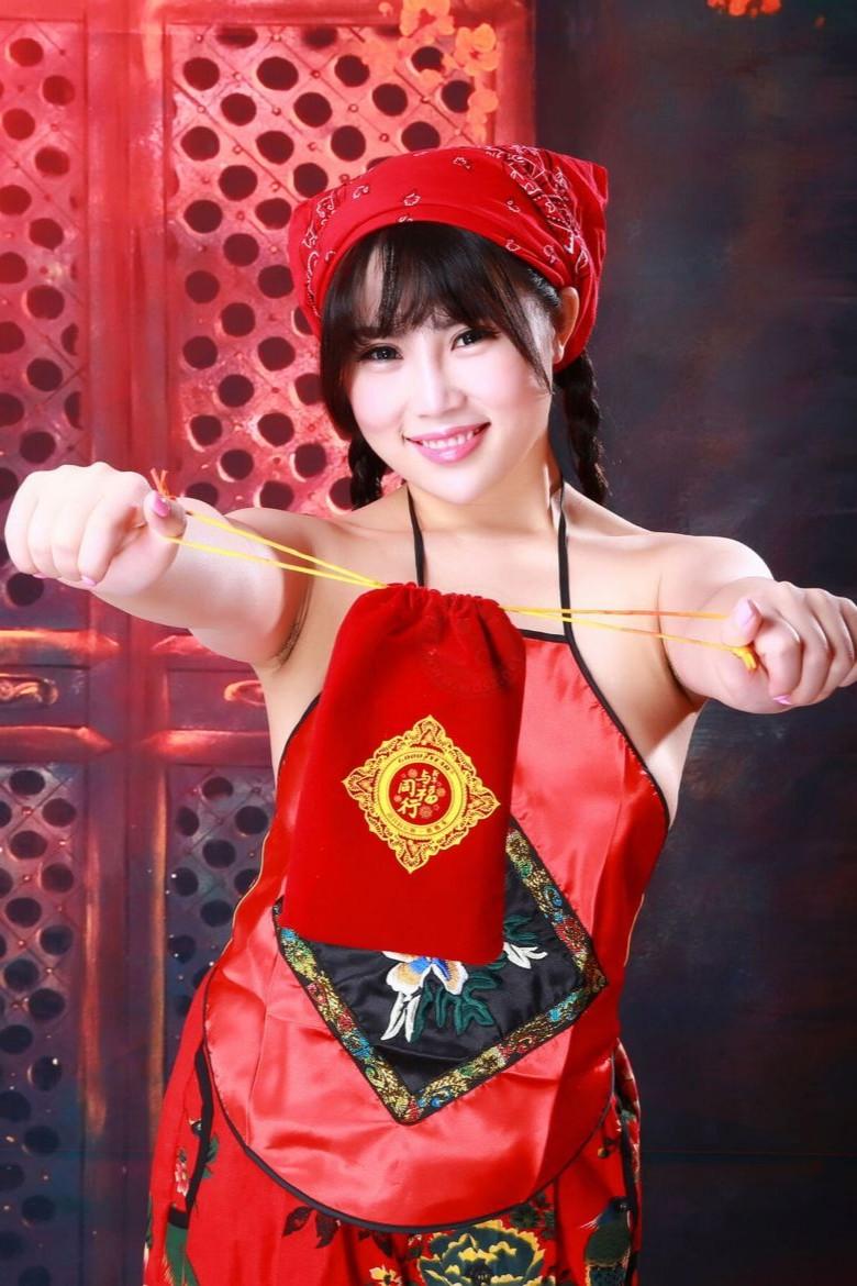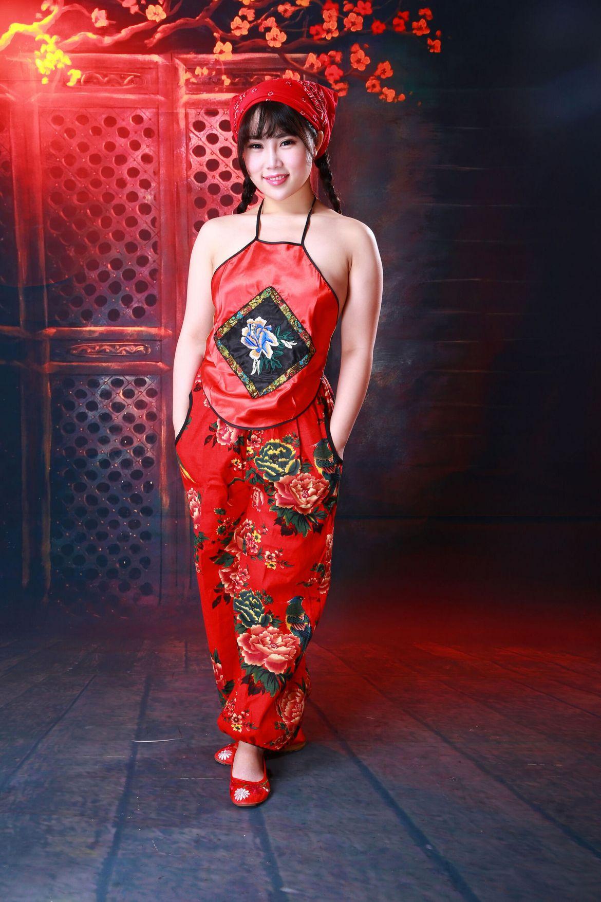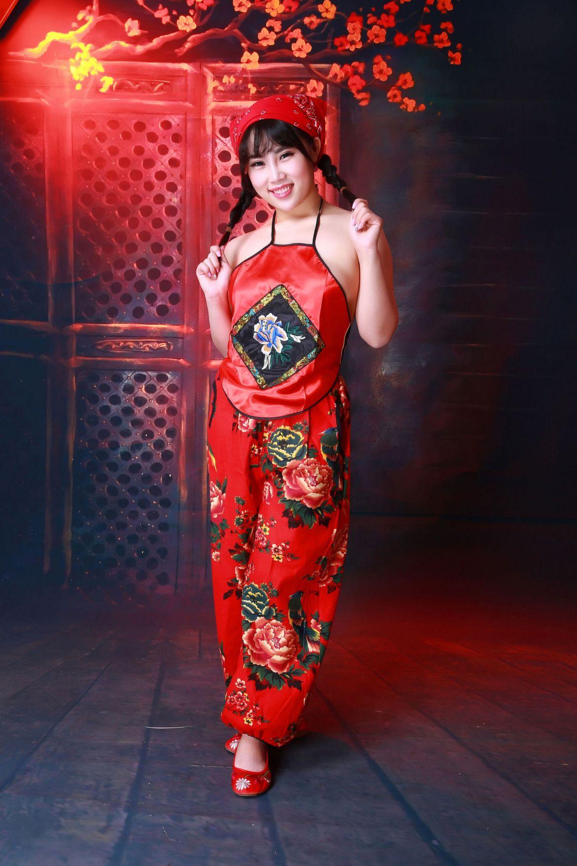 晒图笔记大赛大红肚兜刺绣如锦簇花团,牡丹纹花布裤艳似调色盘,红头巾绾起麻花辫如年