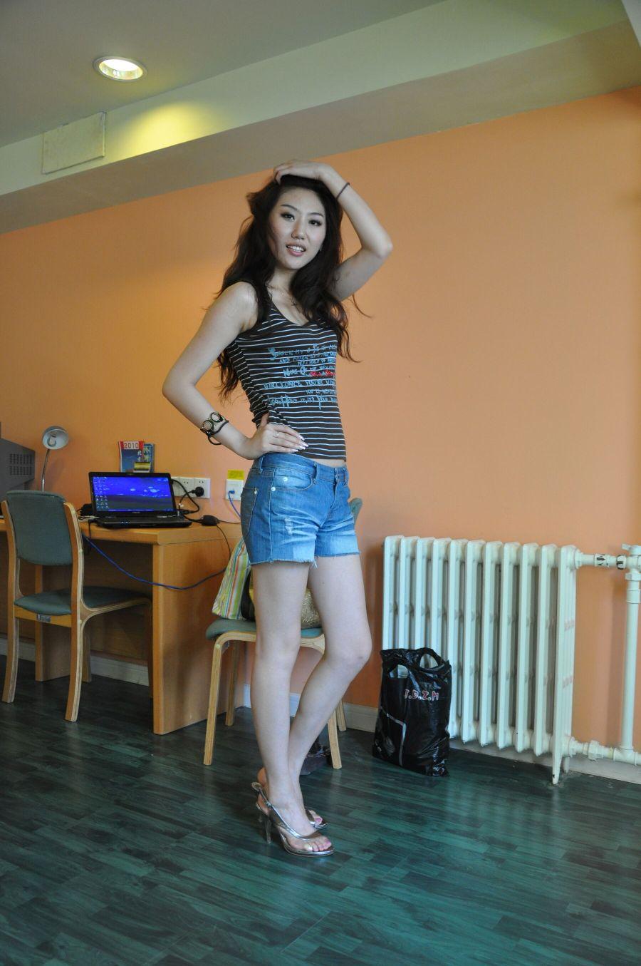 晒图笔记大赛黑棕条纹无袖背心搭做旧牛仔短裤,配银色细高跟,是休闲中透着精致的轻熟