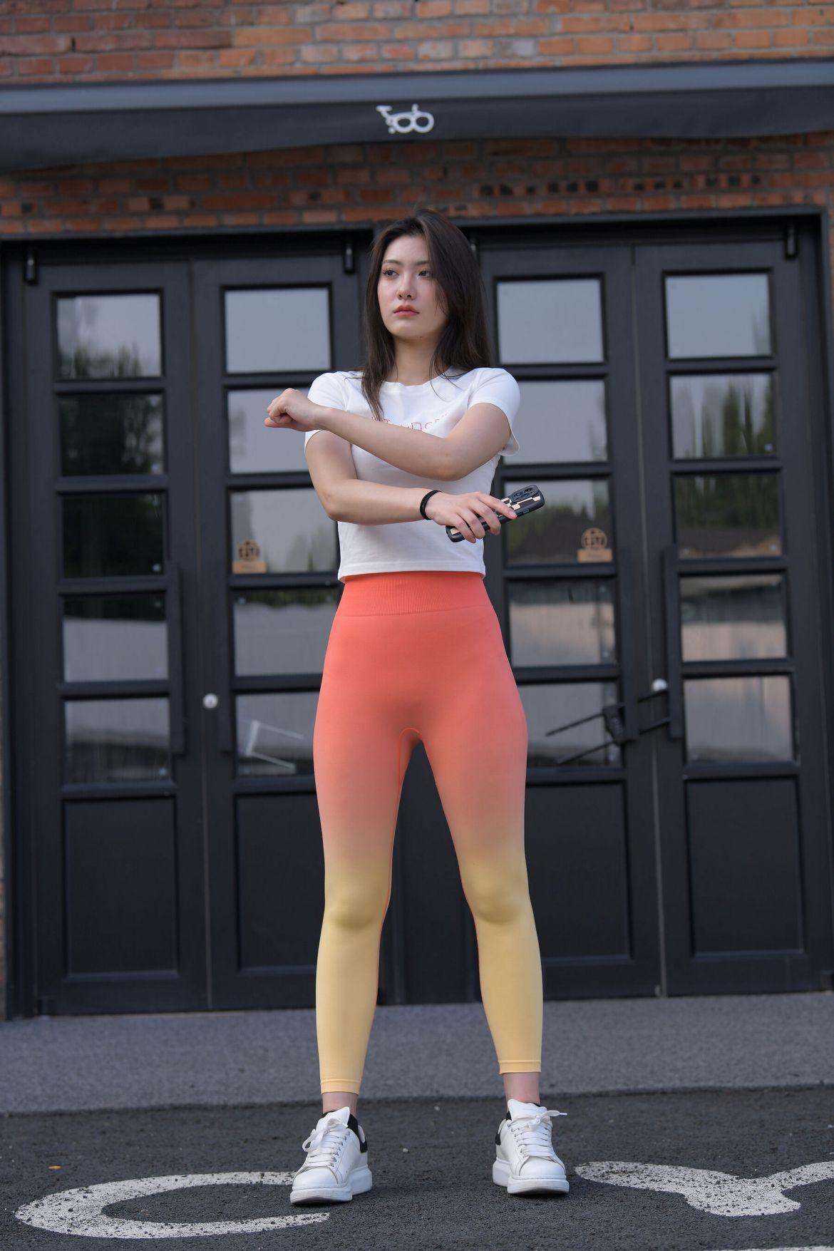 晒图笔记大赛这组图片的穿搭风格是简约运动风,白色短款T恤搭配橙黄渐变紧身裤,脚踩白色运动鞋,整体活力又时尚。