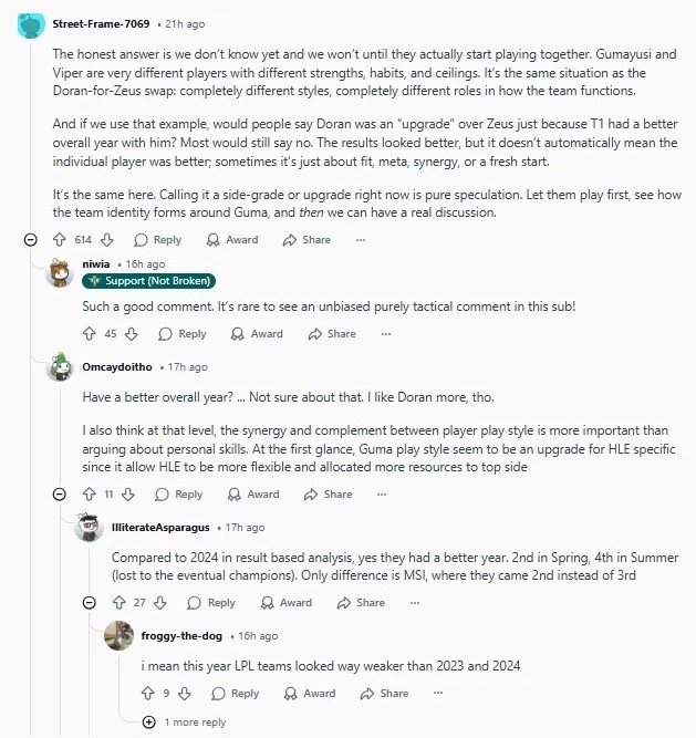 我也认为,在那个水平上,选手风格之间的协同和互补比争论个人能力更重要。乍一看,Guma的风格似乎对HLE来说是一种升级,因为它能让HLE更加灵活,并将更多的资源分配到上路。
