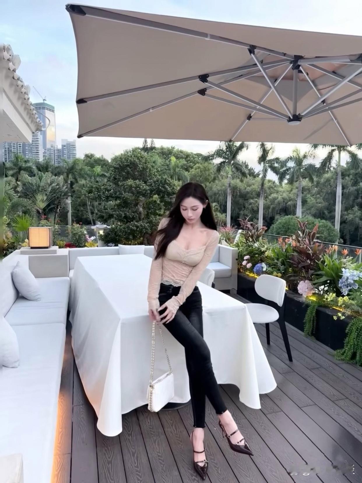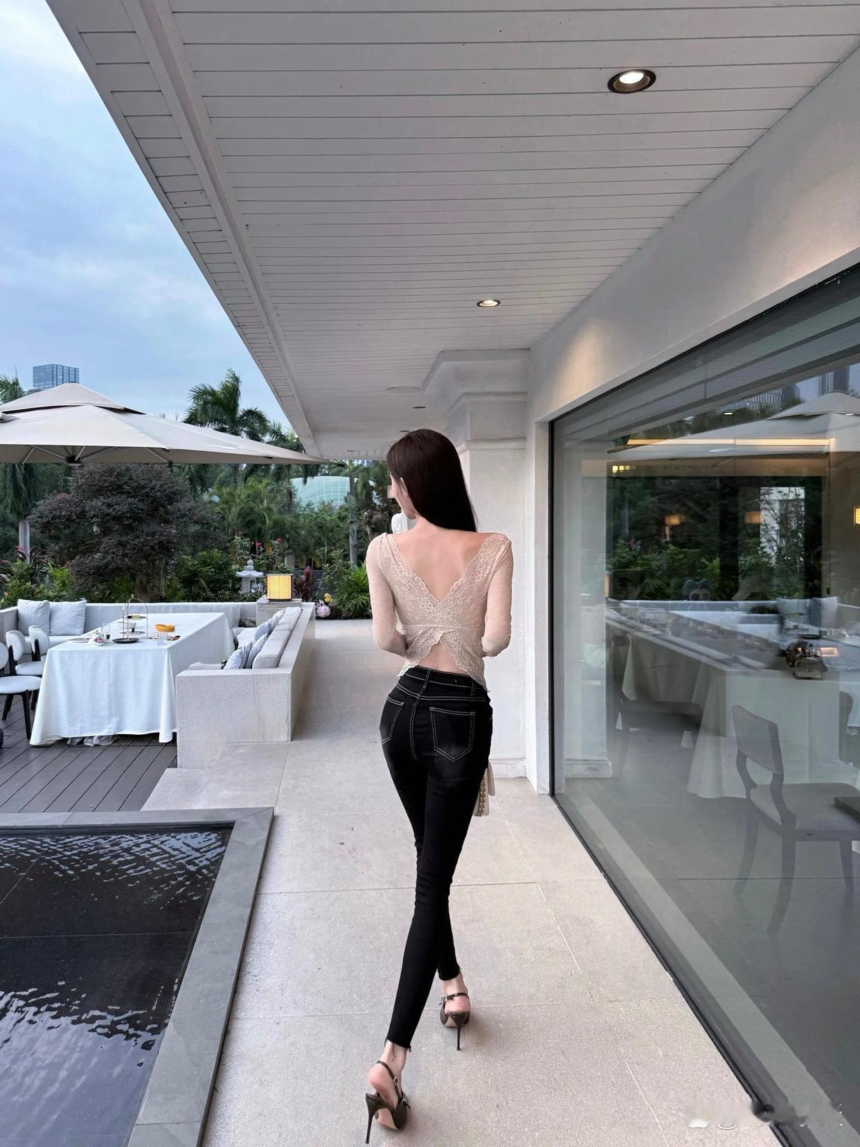 哇,这小姐姐也太会穿了~ 她上身穿了件浅米色蕾丝长袖上衣,蕾丝材质精致又带着柔美感,长袖设计增添了几分温婉,低领和露背的细节,又透出小性感,很好地展现出肩颈与背部线条。下搭黑色紧身牛仔裤,紧紧贴合腿部,把修长笔直的腿型完美勾勒出来。脚上是一双深色尖头高跟鞋,增加了优雅气质,还拉长了腿部比例。再搭配白色链条包,整体穿搭优雅又时尚,将身材优势尽显,十分吸睛。
