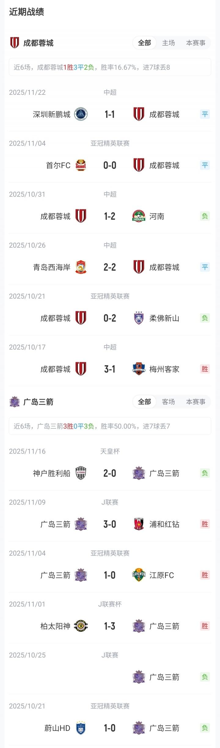 亚冠精英联赛东亚区积分榜上,成都蓉城1胜1平2负积4分,位列第11;广岛三箭2胜1平1负积7分,位列第3。