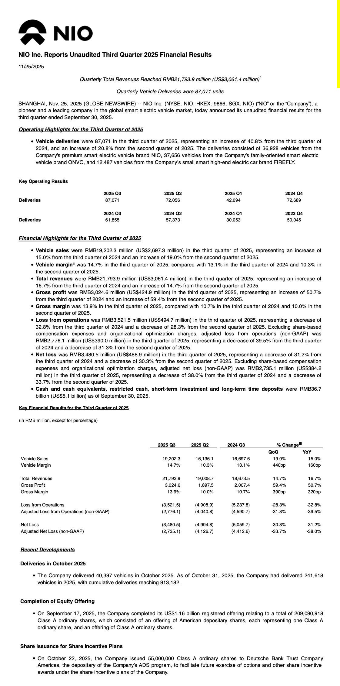 蔚来2025年三季度财报来了:未盈利,但向好! -车辆交付,87071台,同比增长40.8%,环比增长20.8%; -总营收217.99亿元,同比增长16.7%,环比增长14.7%; -综合毛利率13.9%,整车毛利率14.7%,创新高; -毛利润30.2亿元; -净亏损34.8亿元; -研发费用23.9亿元; -现金储备367亿元,现金流转正,环比增长近百亿。 四季度指引: -预期交付12-12.5万台,同比增长超65%; -预期营收327.6-340.4亿元,同比增长超66.3%。【来自懂车帝车友圈】