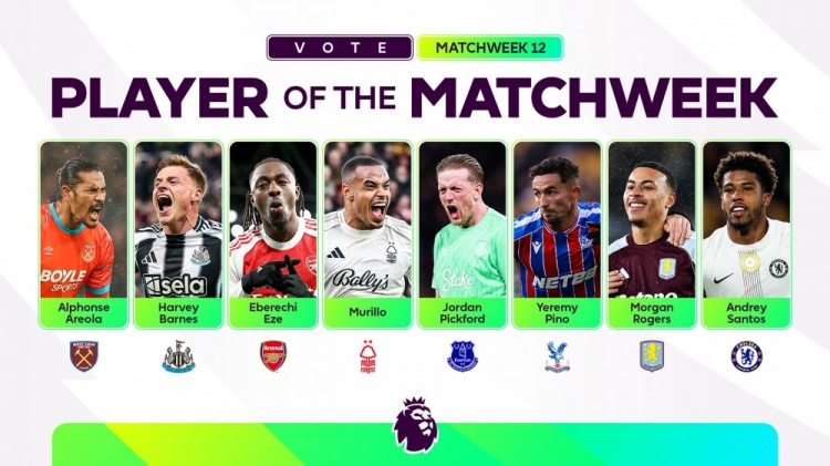 直播吧11月25日讯英超第12轮联赛已经完赛,英超官方也列出了本轮最佳球员的8人候选名单: