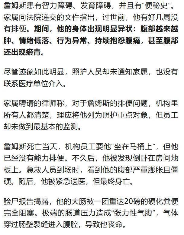 据潇湘晨报报道,近日,美国俄亥俄州巴泽塔镇一家名为“ClearSkiesAhead”的照护机构被告上法庭。去年11月,41岁男子詹姆斯·斯图尔特在该机构内身亡,死因为大肠被一团重达20磅(约9公斤)的硬化粪便完全堵塞。