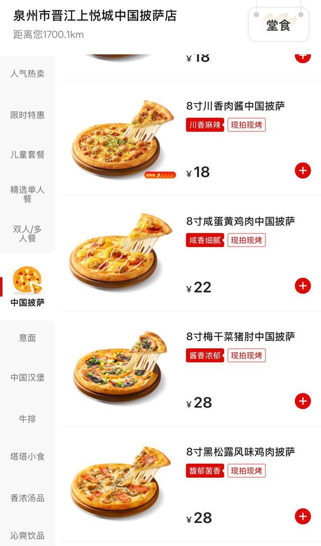 记者注意到,与主打“中国汉堡”的红色门头不同,新门店采用明黄色调,展现出全新品牌形象。菜单上除了传统西式披萨外,还推出了“川香肉酱中国披萨”“梅干菜猪肘中国披萨”“麻婆豆腐中国披萨”等多款中式创新口味,延续了“中式再造西餐”的产品策略。