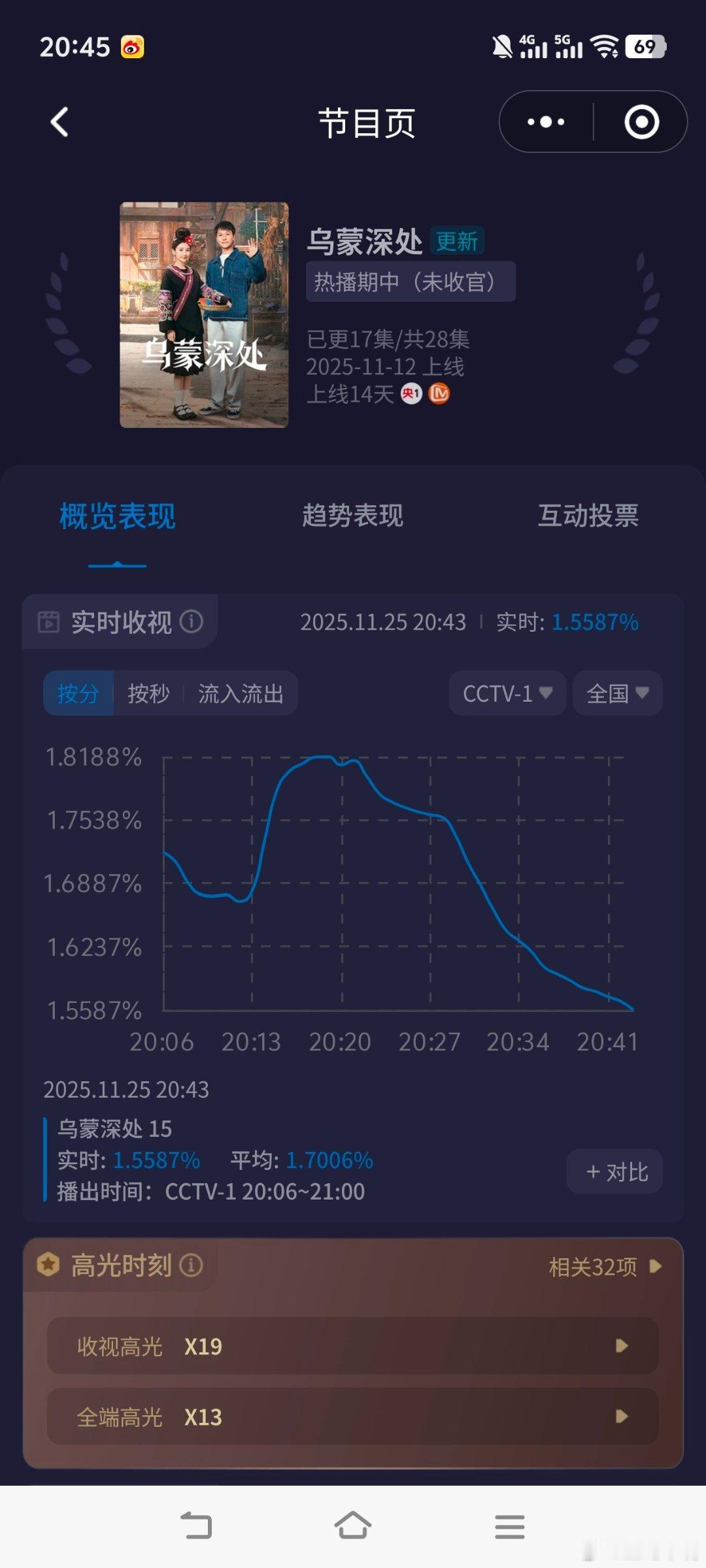 毛晓彤 秦俊杰《乌蒙深处》今晚收视创新高,第一集峰值1.8188,开播以来新高!平均也新高了!恭喜!