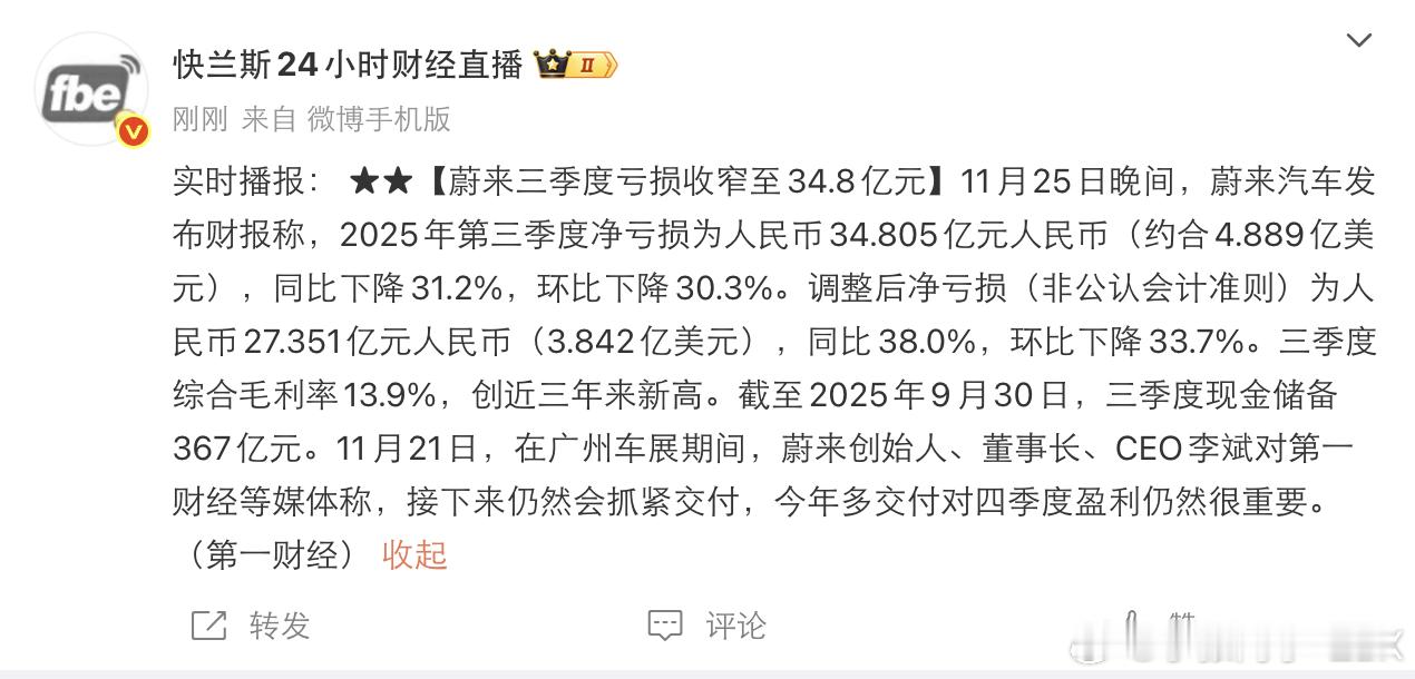 蔚来三季度亏损收窄至34.8亿元,同比下降31.2%,环比下降30.3%。调整后