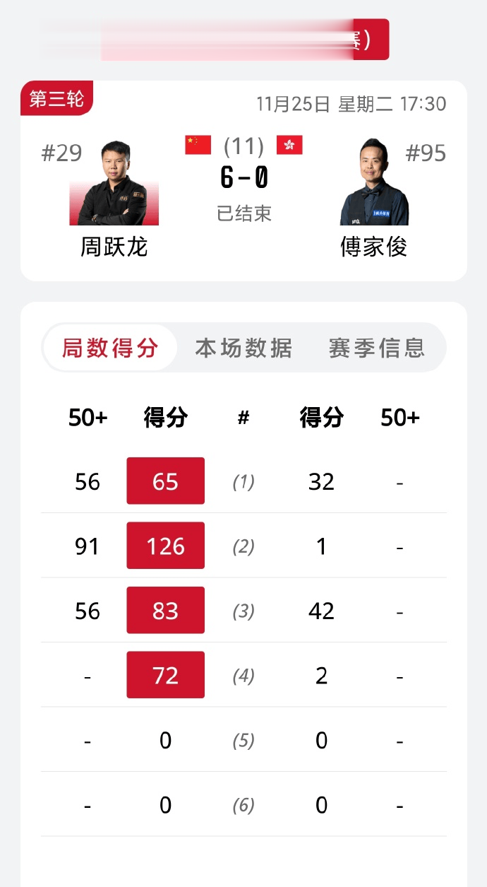 周跃龙在比赛中取得4-0领先后,傅家俊因眼部不适被迫选择退赛,最终比分结果为6-0。