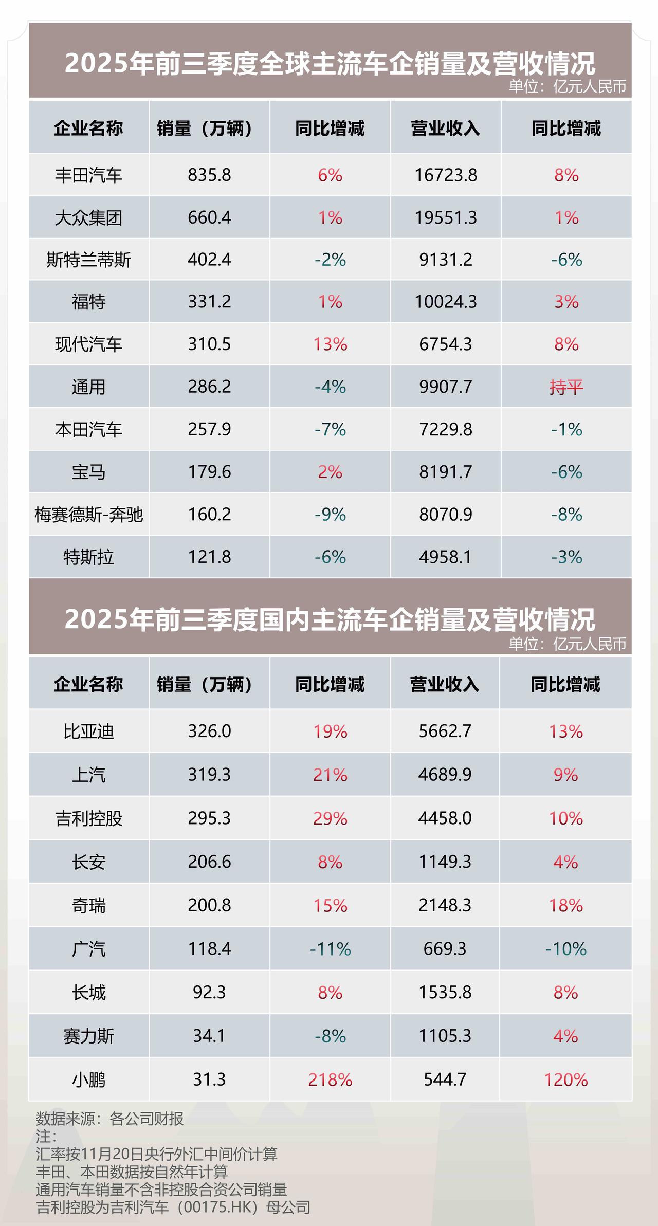 剖析全球车企三季报,汽车格局呈现东升西降,中国车企强势崛起 转眼间今年即将过去,结合全球车企三季报数据来看,不得不说出汽车行业分化加剧。可以很明显的感受到国外老牌汽车巨头集体陷入困境,展现出疲态。其中丰田、大众等车企尚能维持相对稳定,但奔驰、本田、斯特兰蒂斯等品牌却出现不同程度下跌。除此之外,在净利润方面,我发现很多国外车企降幅超50%,就连一向稳健的丰田也出现了16%的下滑,反映出海外传统车企在市场变革中面临巨大挑战。 与之形成鲜明对比的是,中国车企正以迅猛之势崛起,发展势头相当的强劲。比亚迪、上汽、吉利、奇瑞、小鹏等均实现销量两位数及以上增长。其中,比亚迪表现尤为突出,前三季度销量高达326万辆,成功跻身全球前五,距离福特仅有5万辆的差距,这一成绩相当的耀眼! 除此之外,在营收方面,中国车企也交出了精彩答卷。在今年1-9月份中,比亚迪、吉利控股、奇瑞等均实现了两位数增长。而反观国外车企,营收增速普遍为个位数,奔驰、宝马等甚至出现了负增长。这一对比,不得不说国产汽车品牌太给力了! 当然,中国车企的崛起并非偶然,这源自于对尖端技术的死磕。就好在研发投入上,国产汽车品牌普遍要高于国外车企,例如当中的比亚迪研发投入达437亿元,同比增长31%,在国产品牌中独占鳌头。其带来了大量的先进技术成果,例如第五代DM技术、兆瓦闪充等等,表现出了极高竞争力。 中国车企用技术实力赢得市场!随着国产汽车在技术研发、品牌建设等方面持续发力,未来在全球汽车市场势必展现出更加强大的地位,进一步改写行业格局。