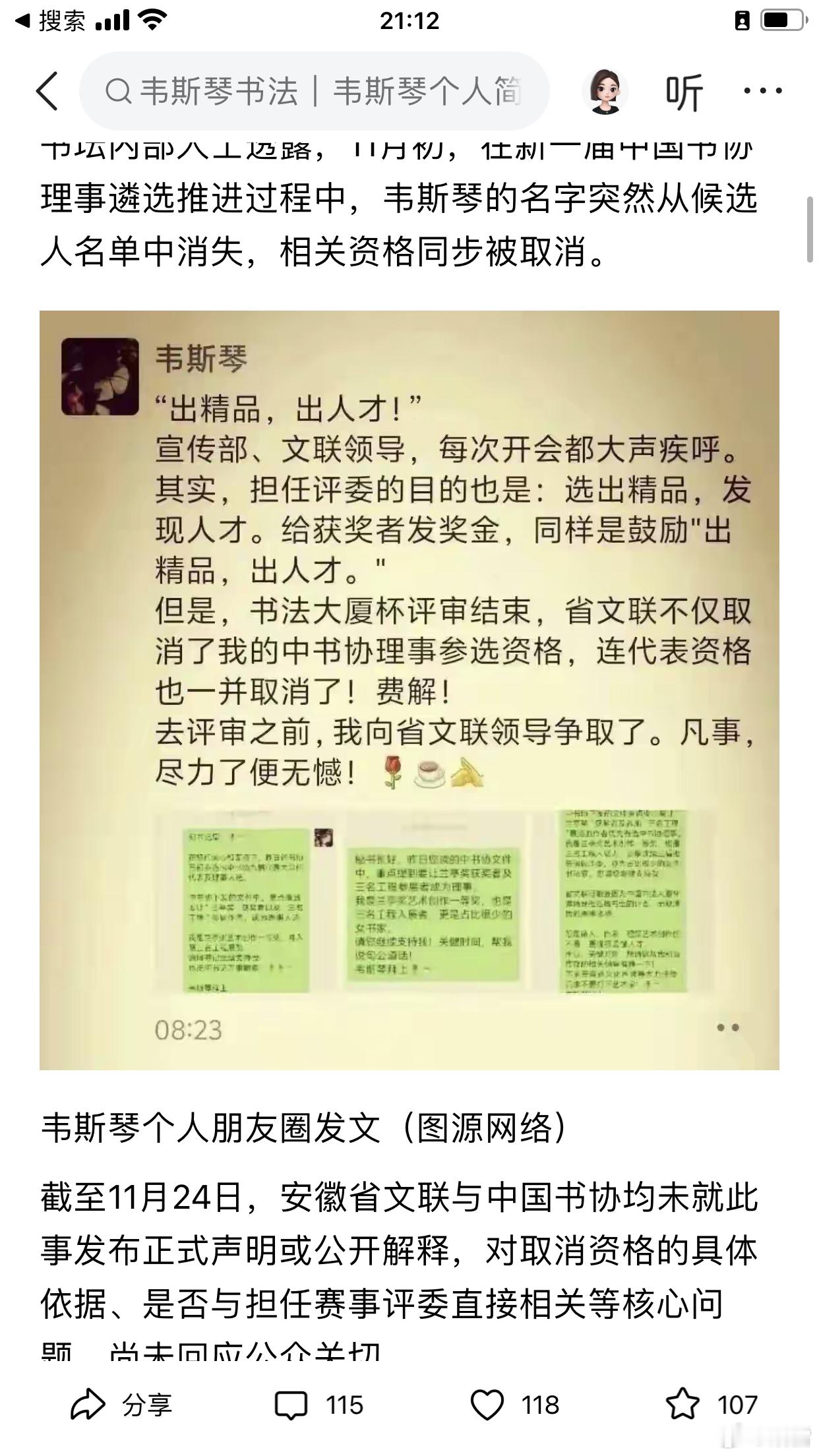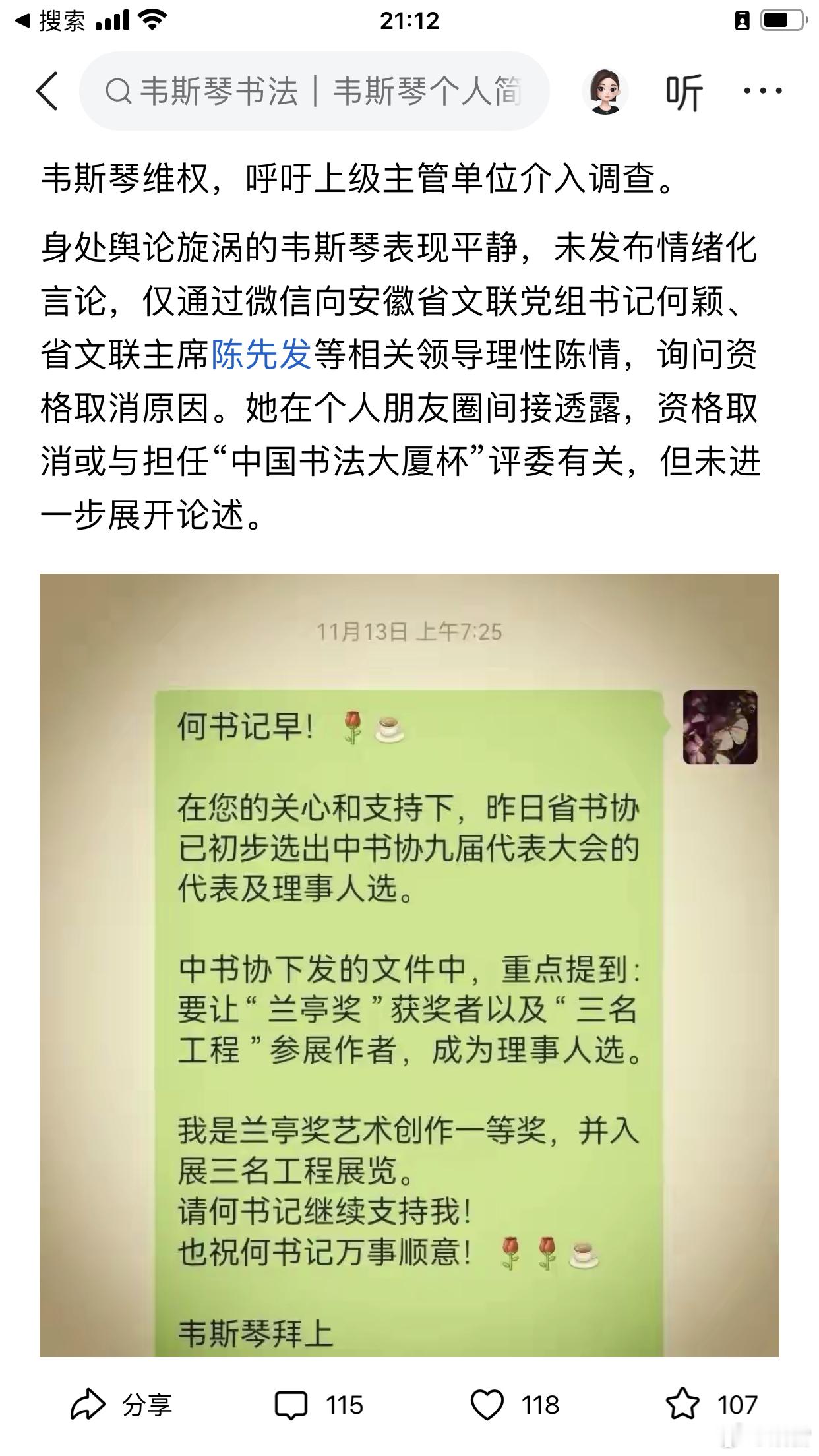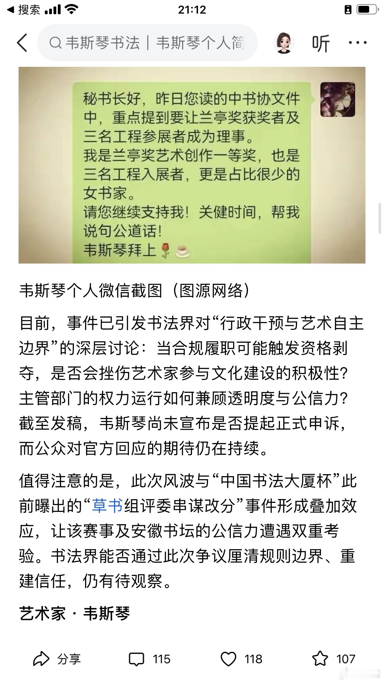书法大厦杯丑闻持续发酵: 除了书法家卷入,评委也被殃及。原因之一,可能是奖金在丰厚到有利益输入的程度,写个书法,夺个头奖,就五十万,可能就是这个银行里的数字导致评委和书法家纷纷内卷,拉票,吕联,改分,种种操作真是打破脑袋。现在这好,草书出了问题,头奖50万被取消,书法家延志超声称没证据要申诉;今天,安徽美女书法家韦斯琴也浮出水面,中国书协理事,没了,这可是一件大事。书协会员含金量已经是高成色,书协理事,堪比书法黄金,这个没了,更是大事。写给安徽文联书记何颖,文联主席陈先发的短信不是截屏,这正规媒体的报道,这也让人吃一惊。看来,这也是丑闻刚刚发酵,远未到结束。