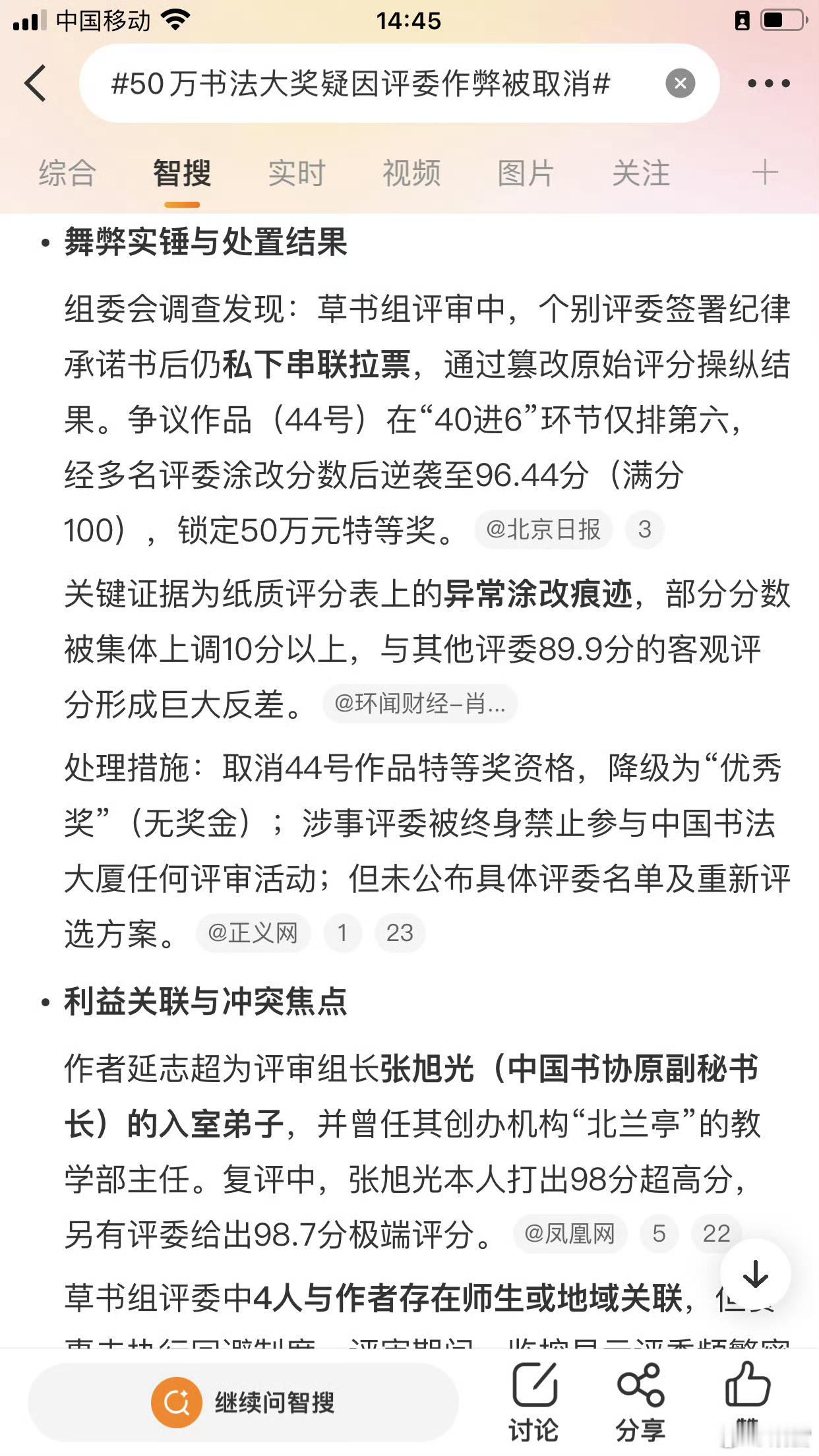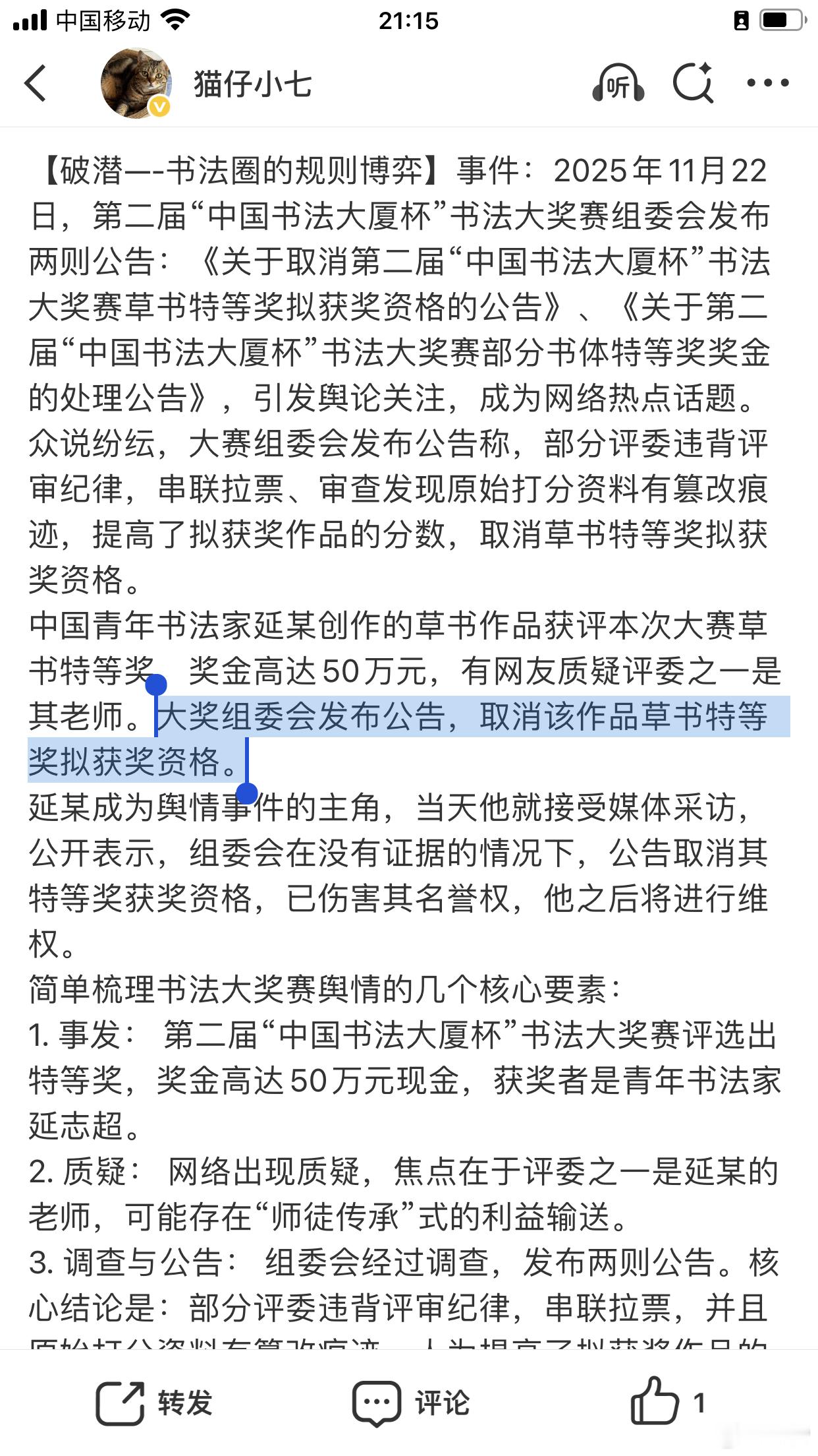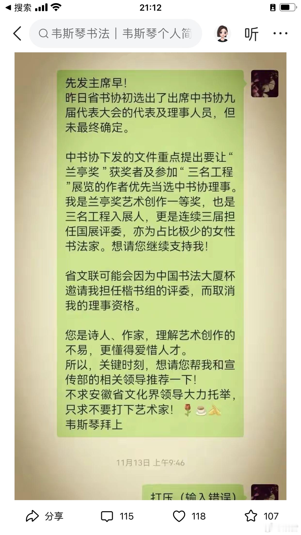 书法大厦杯丑闻持续发酵: 除了书法家卷入,评委也被殃及。原因之一,可能是奖金在丰厚到有利益输入的程度,写个书法,夺个头奖,就五十万,可能就是这个银行里的数字导致评委和书法家纷纷内卷,拉票,吕联,改分,种种操作真是打破脑袋。现在这好,草书出了问题,头奖50万被取消,书法家延志超声称没证据要申诉;今天,安徽美女书法家韦斯琴也浮出水面,中国书协理事,没了,这可是一件大事。书协会员含金量已经是高成色,书协理事,堪比书法黄金,这个没了,更是大事。写给安徽文联书记何颖,文联主席陈先发的短信不是截屏,这正规媒体的报道,这也让人吃一惊。看来,这也是丑闻刚刚发酵,远未到结束。