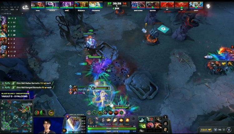 [31分钟]flyfly圣堂带队上路上高,skiter熊战士入场吃了一堆控制输出打不到人被圣堂击杀,Sneyking双头龙上来保大哥被boboka蝙蝠拉住,能来不能走,YB杀上高地,Falcons双辅助买活,Malrine龙骑士残血打掉了圣堂的盾,圣堂盾起无人能处理,Falcons上路被拆。