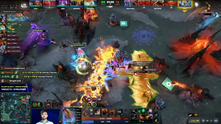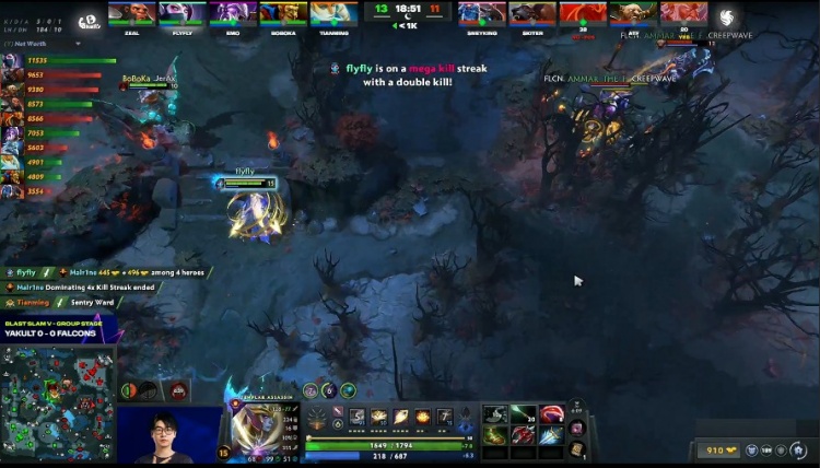 [18分钟]Falcons入侵人不齐,emo紫猫将Crit宙斯下坡后拉回来输出开团,flyfly圣堂输出打满,打宙斯弹了skiter熊战士的盾,Marlrine龙骑士则撤退时候被留,圣堂双杀,个人经济领跑。