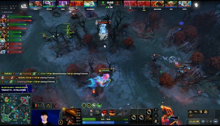 [17分钟]zeal斧王到对方野区刷钱被发现,Sneyking双头龙将人冰住,Malrine龙骑士输出,斧王倒地,Falcons回头控下肉山,skiter熊战士带盾。