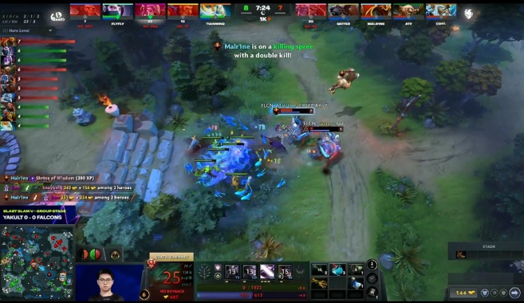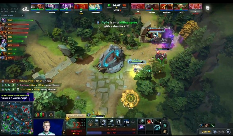 [14分钟]Falcons又入侵抢符,这次flyfly圣堂和Emo紫猫配合留人输出,sneyking双头龙和Crit宙斯都被圣堂击杀,Malrine龙骑士过来晚了一步,并未留到残血紫猫。