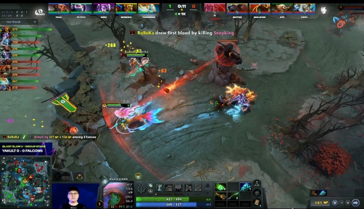 [0分钟]刚开局天命小娜迦和boboka蝙蝠骑士追击Sneyking双头龙,蝙蝠完成击杀获得一血。