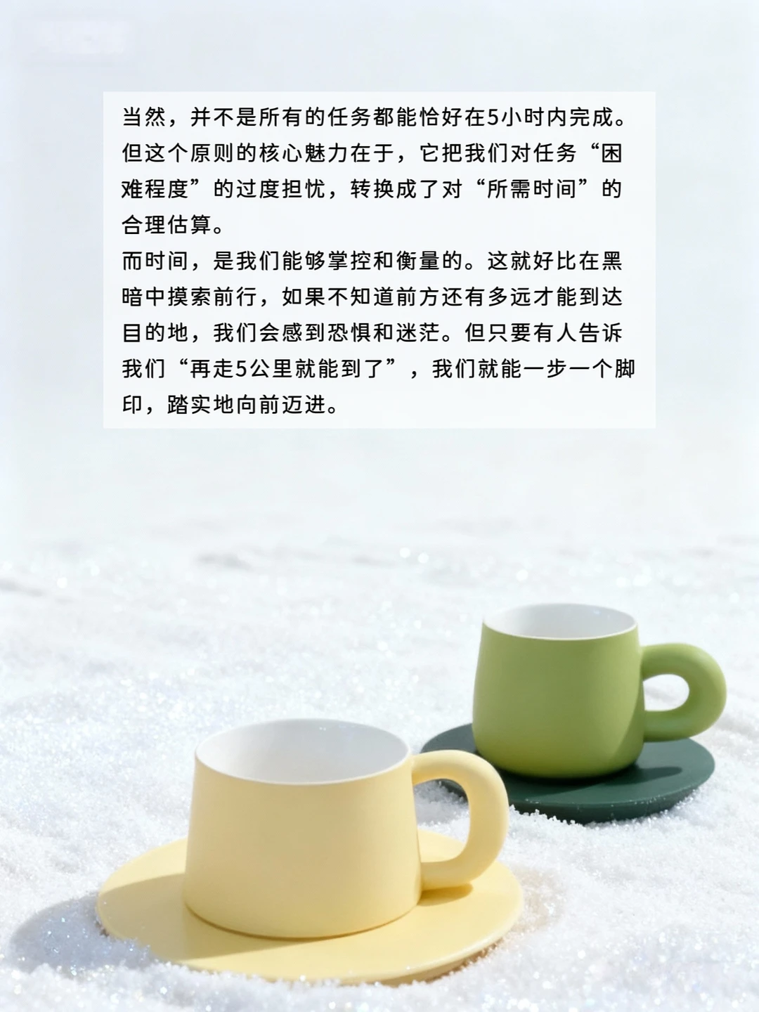 当然,并不是所有的任务都能恰好在5小时内完成。但这个原则的核心魅力在于,它把我们对任务“困难程度”的过度担忧,转换成了对“所需时间”的合理估算。