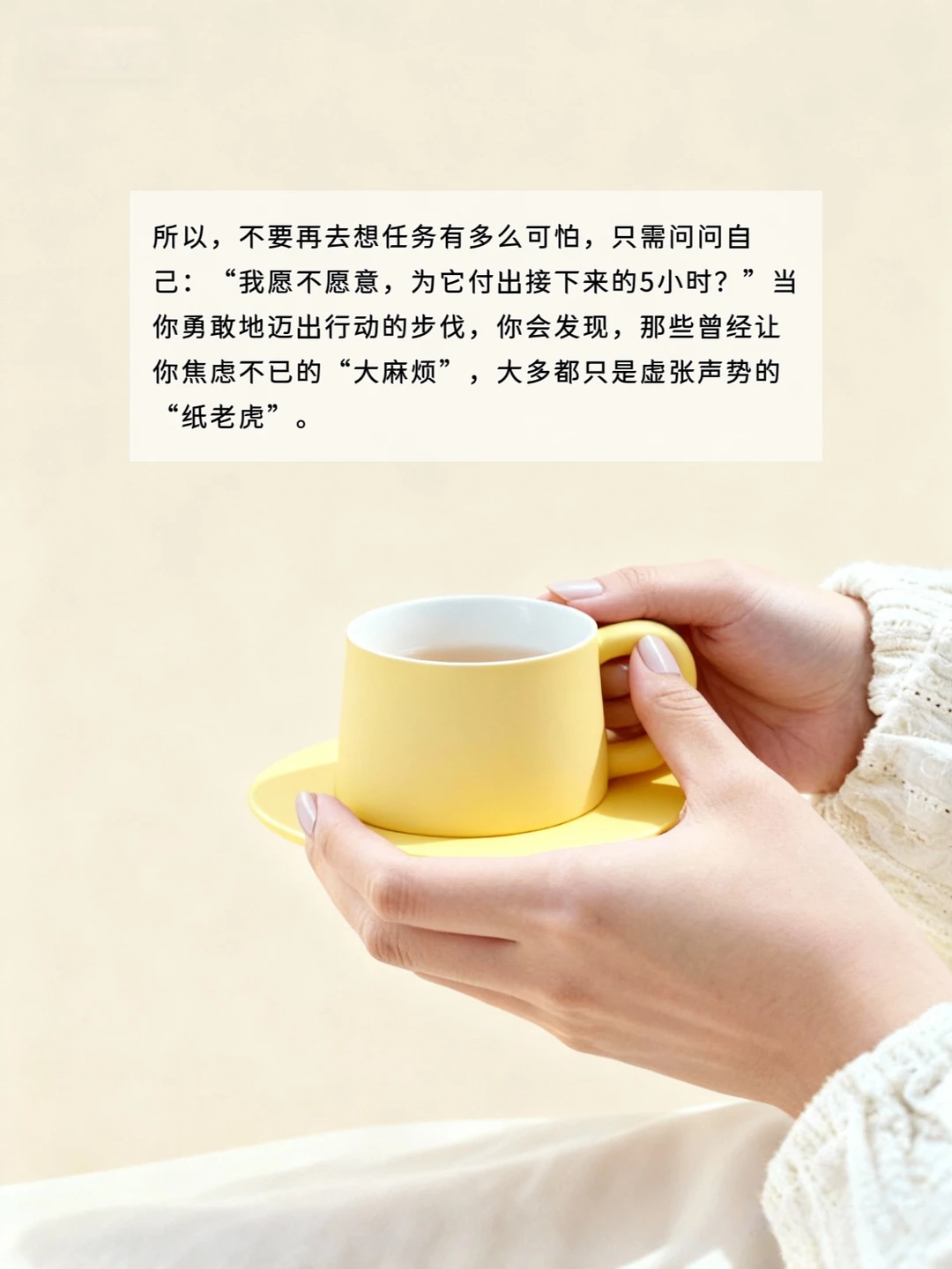 所以,不要再去想任务有多么可怕,只需问问自己:“我愿不愿意,为它付出接下来的5小时?”当你勇敢地迈出行动的步伐,你会发现,那些曾经让你焦虑不已的“大麻烦”,大多都只是虚张声势的“纸老虎”。