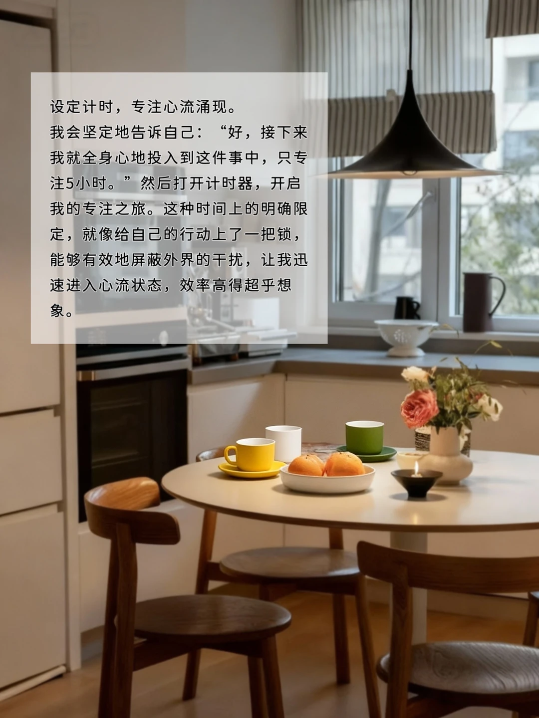 我会坚定地告诉自己:“好,接下来我就全身心地投入到这件事中,只专注5小时。”然后打开计时器,开启我的专注之旅。这种时间上的明确限定,就像给自己的行动上了一把锁,能够有效地屏蔽外界的干扰,让我迅速进入心流状态,效率高得超乎想象。
