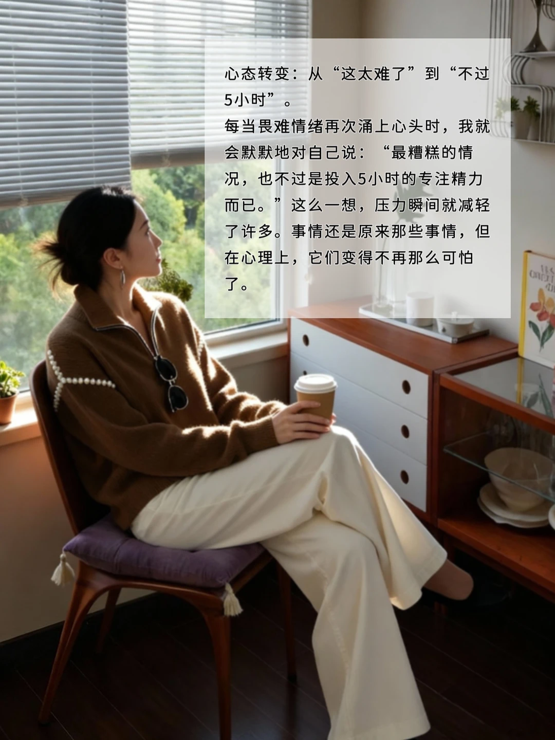 每当畏难情绪再次涌上心头时,我就会默默地对自己说:“最糟糕的情况,也不过是投入5小时的专注精力而已。”这么一想,压力瞬间就减轻了许多。事情还是原来那些事情,但在心理上,它们变得不再那么可怕了。