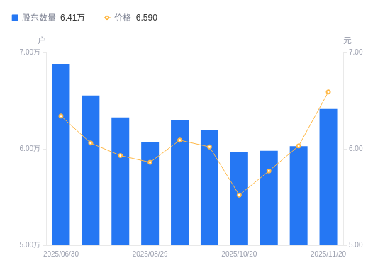 近一年(2024年11月29日至2025年11月20日),福能东方A股股东户数从8.96万户,减低至6.41万户,降幅28.39%,区间股价下跌25.79%。