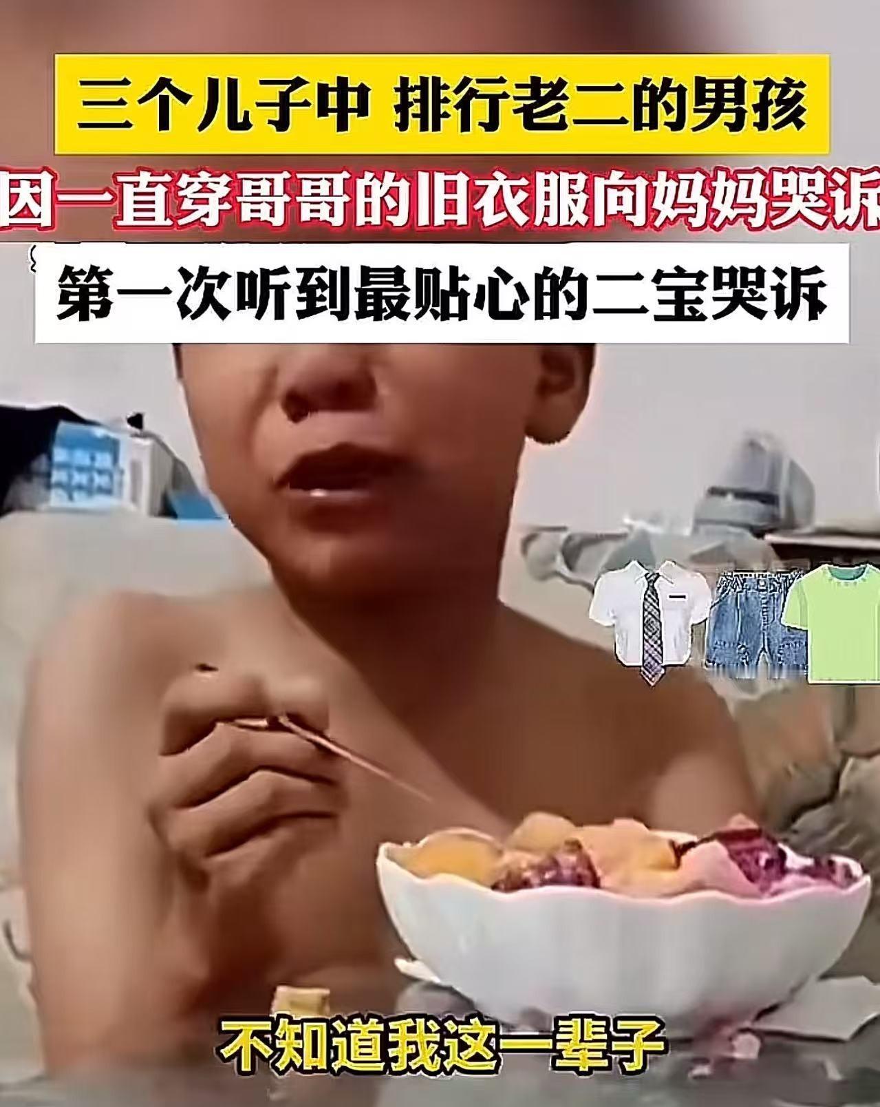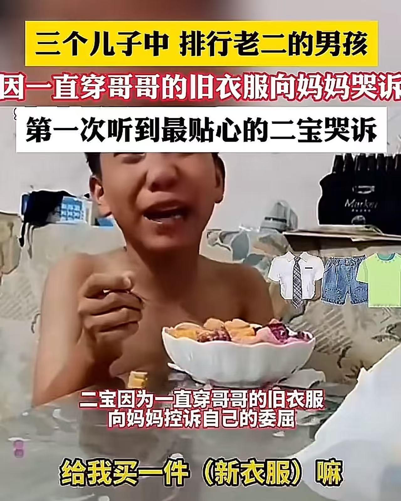 邻居张阿姨有仨儿子,日子过得紧巴巴。她想了个法子让老大衣服穿小了给老二,老二穿小了再给老三。可最近闹出事了,张阿姨给老大老三买了新衣,老二问为啥不给他买。 老二说自个儿从没穿过带标签的新衣,张阿姨才反应过来,原来老二一直懂事,从不跟弟弟抢东西还帮照顾弟弟。这下她愣住了,赶紧抱着老二道歉。 有网友说他小时候也常穿哥哥衣服,上小学时同学送衣服被误解成新买的,回家后他爸妈再没让他穿二手衣。还有人回忆小时候家里吃肉,中间孩子总没份儿,现在想想心里还难受。 其实省着花钱可以理解,但总让中间孩子穿旧衣容易让他心里憋屈。就算买件便宜的新衣,让孩子自己选颜色也能不一样。每个孩子都应该被平等看待,不能总当"过渡品"。