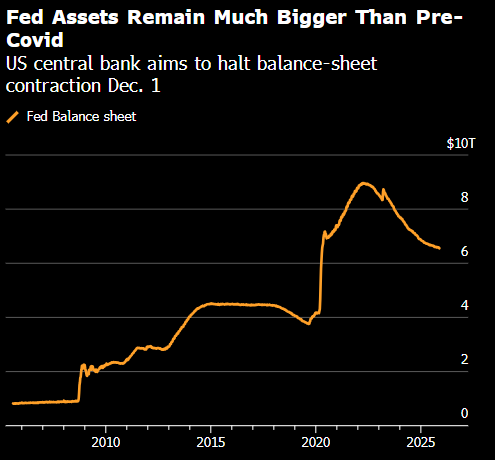 美联储决策者上个月决定将从12月1日开始停止缩表,以确保流动性保持“充足”。美联储自2022年6月开始收缩资产负债表。