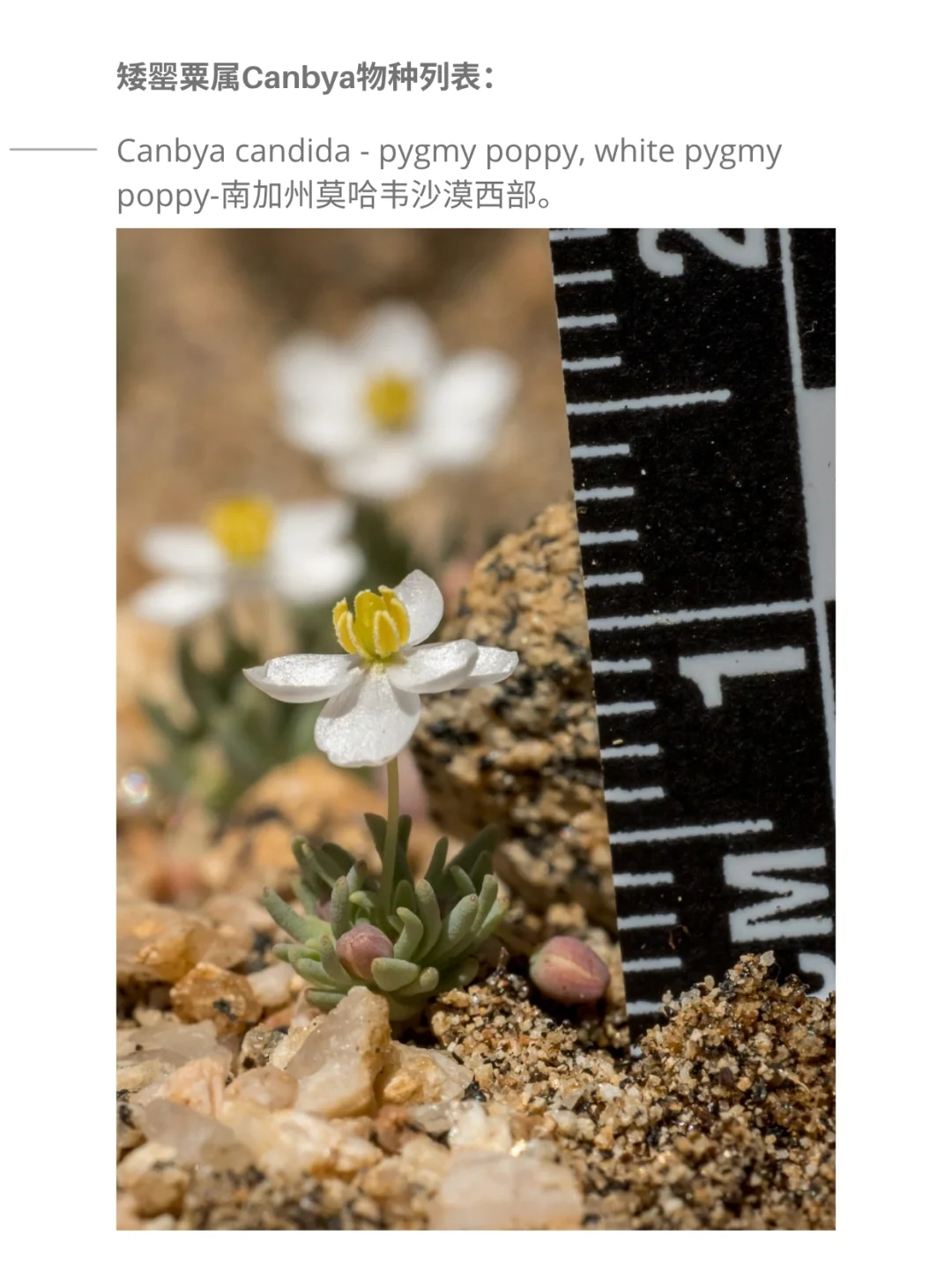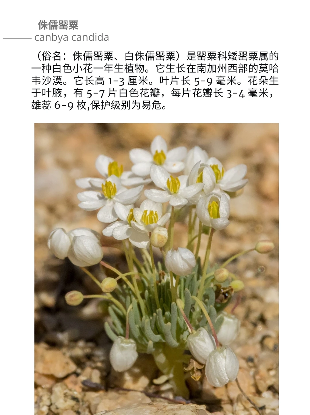 山野草 一年生草本植物 一年生草本花卉 迷你植物 侏儒植物 易危物种 侏儒罂粟 罂粟科 矮罂粟属 (俗名:侏儒罂粟、白侏儒罂粟)是罂粟科矮罂粟属的一种白色小花一年生植物。它生长在南加州西部的莫哈韦沙漠。它长高 1-3 厘米。叶片长 5-9 毫米。花朵生于叶腋,有 5-7 片白色花瓣,每片花瓣长 3-4 毫米,雄蕊 6-9 枚,保护级别为易危。