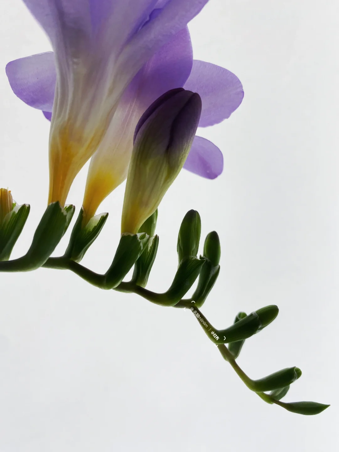 花材:小苍兰 别名:香雪兰 花语:天真烂漫、纯洁 花期:10-15天左右 养护 1⃣️换水:夏季每日一次,水中加营养液或消毒剂 2⃣️清洗:花瓶清洗干净,擦掉水渍,花杆剪根冲洗 3⃣️水位:1/2,浅水位养护。 4⃣️修剪:根部以上2~3cm处45°斜剪(增大吸水面积) 🌈|TIPS|长按自取|感谢喜欢|欢迎分享