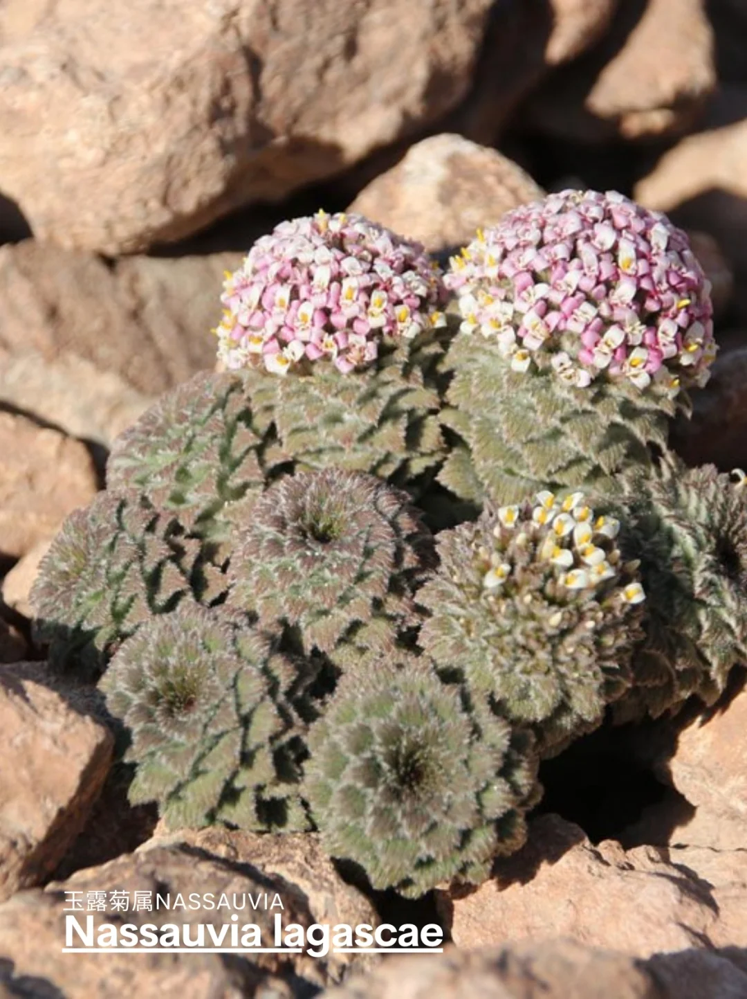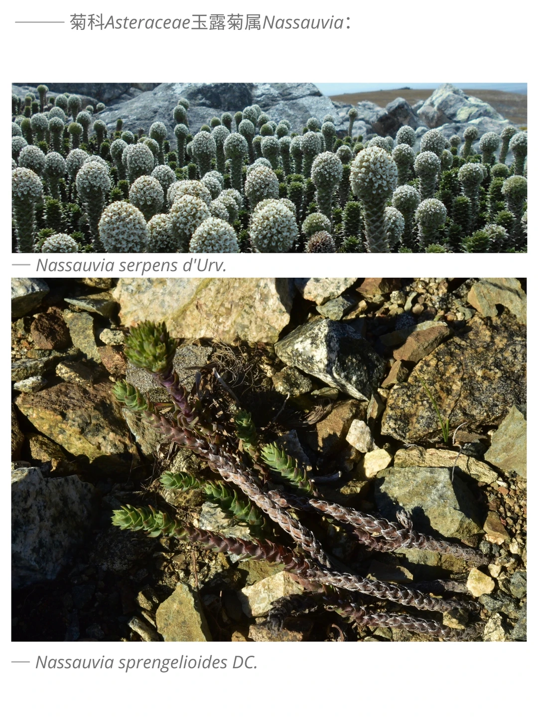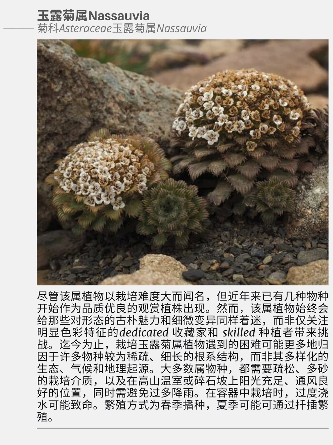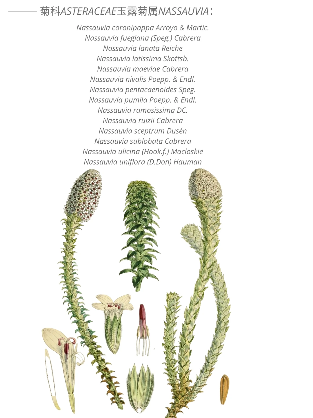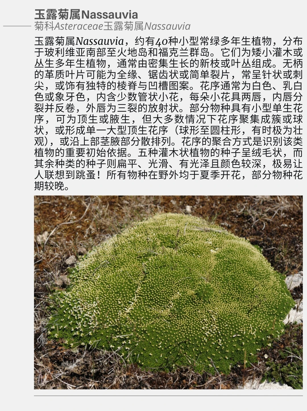 玉露菊属Nassauvia,约有40种小型常绿多年生植物,分布于玻利维亚南部至火地岛和福克兰群岛。它们为矮小灌木或丛生多年生植物,通常由密集生长的新枝或叶丛组成。无柄的革质叶片可能为全缘、锯齿状或简单裂片,常呈针状或刺尖,或饰有独特的棱脊与凹槽图案。花序通常为白色、乳白色或象牙色,内含少数管状小花,每朵小花具两唇,内唇分裂并反卷,外唇为三裂的放射状。部分物种具有小型单生花序,可为顶生或腋生,但大多数情况下花序聚集成簇或球状,或形成单一大型顶生花序(球形至圆柱形,有时极为壮观),或沿上部茎腋部分散排列。花序的聚合方式是识别该类植物的重要初始依据。五种灌木状植物的种子呈绒毛状,而其余种类的种子则扁平、光滑、有光泽且颜色较深,极易让人联想到跳蚤!所有物种在野外均于夏季开花,部分物种花期较晚。