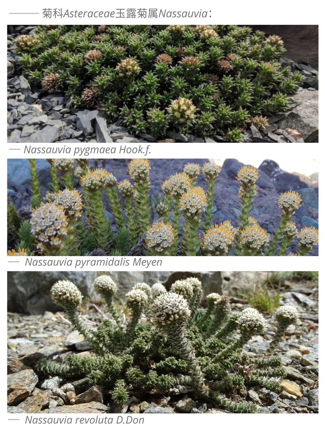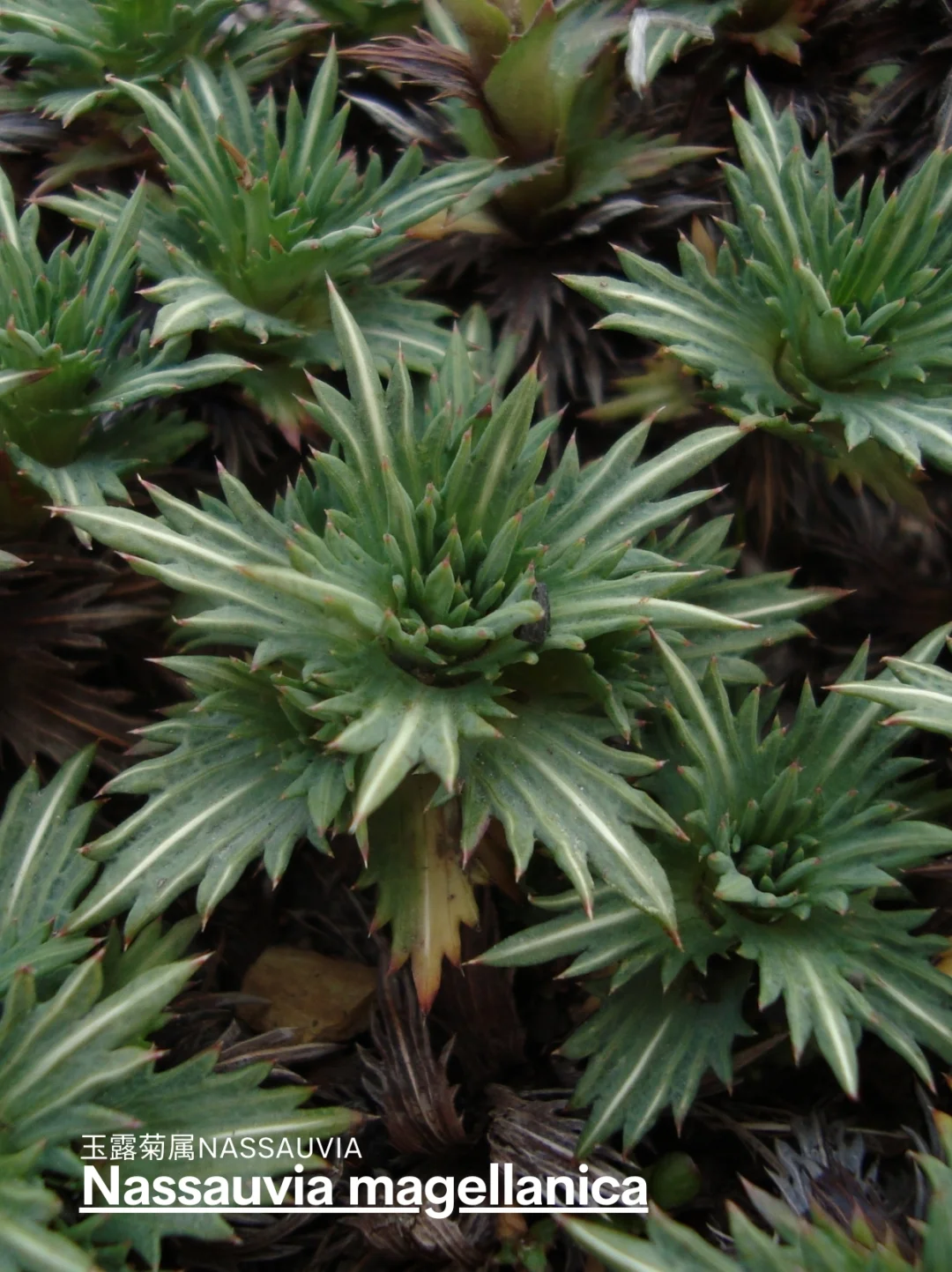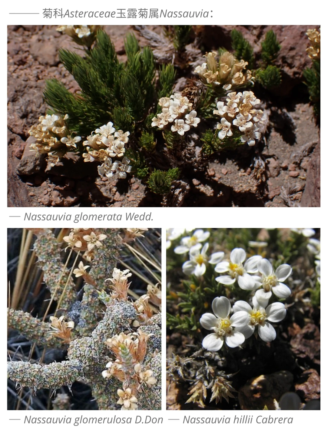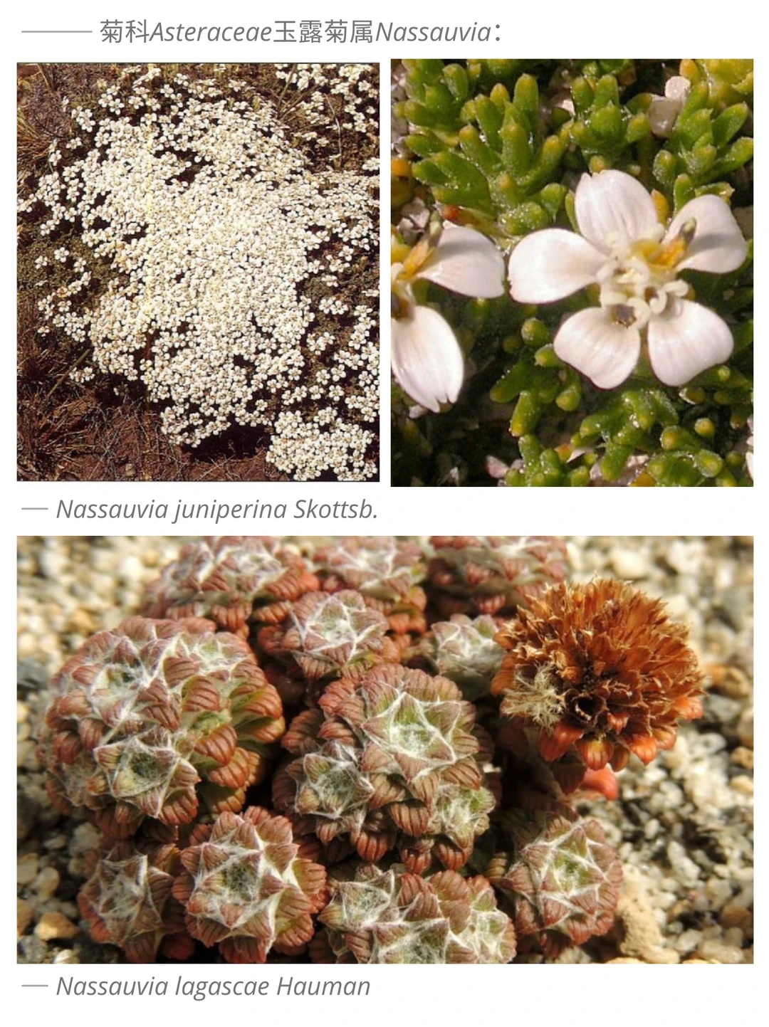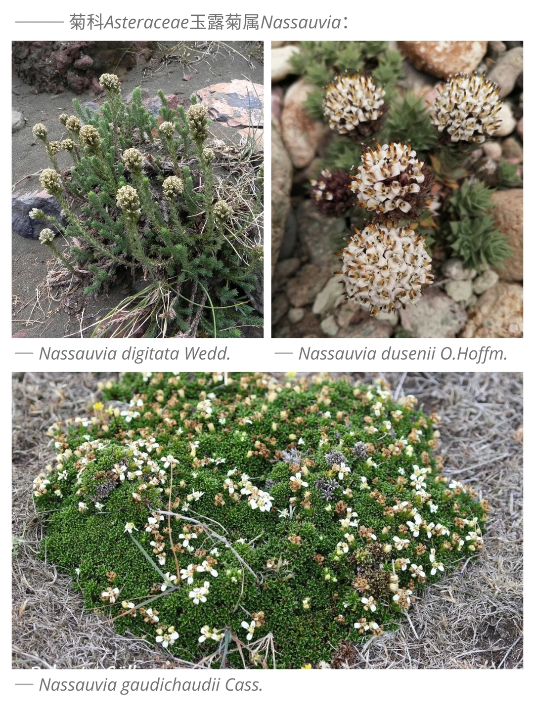 玉露菊属Nassauvia,约有40种小型常绿多年生植物,分布于玻利维亚南部至火地岛和福克兰群岛。它们为矮小灌木或丛生多年生植物,通常由密集生长的新枝或叶丛组成。无柄的革质叶片可能为全缘、锯齿状或简单裂片,常呈针状或刺尖,或饰有独特的棱脊与凹槽图案。花序通常为白色、乳白色或象牙色,内含少数管状小花,每朵小花具两唇,内唇分裂并反卷,外唇为三裂的放射状。部分物种具有小型单生花序,可为顶生或腋生,但大多数情况下花序聚集成簇或球状,或形成单一大型顶生花序(球形至圆柱形,有时极为壮观),或沿上部茎腋部分散排列。花序的聚合方式是识别该类植物的重要初始依据。五种灌木状植物的种子呈绒毛状,而其余种类的种子则扁平、光滑、有光泽且颜色较深,极易让人联想到跳蚤!所有物种在野外均于夏季开花,部分物种花期较晚。