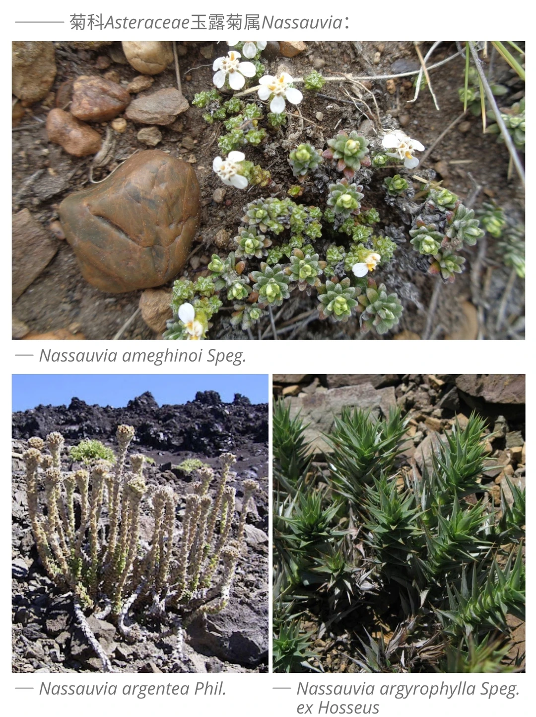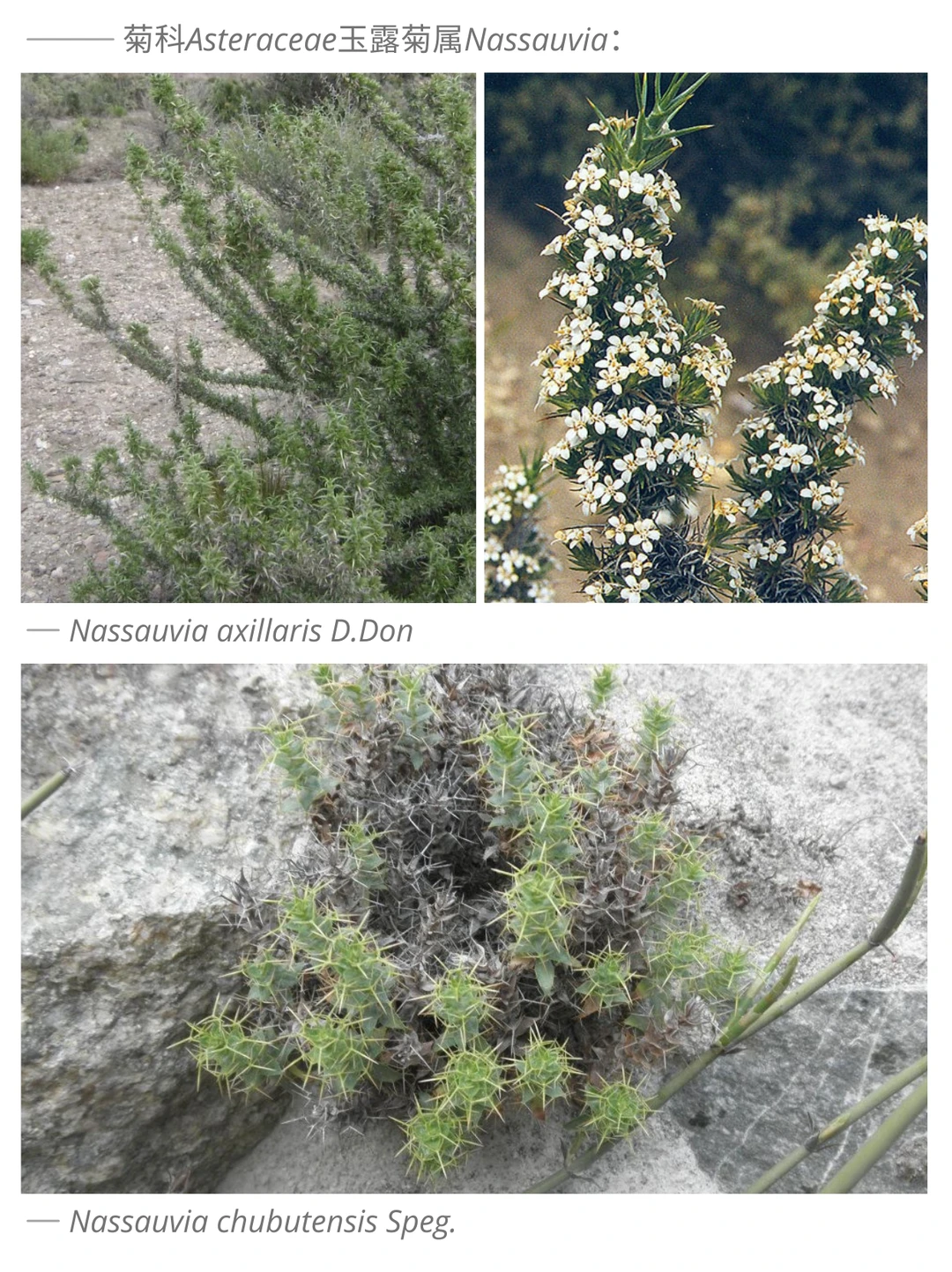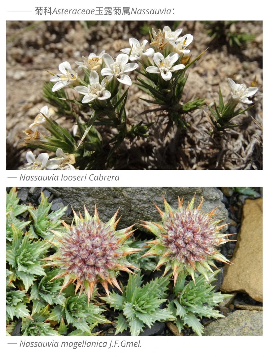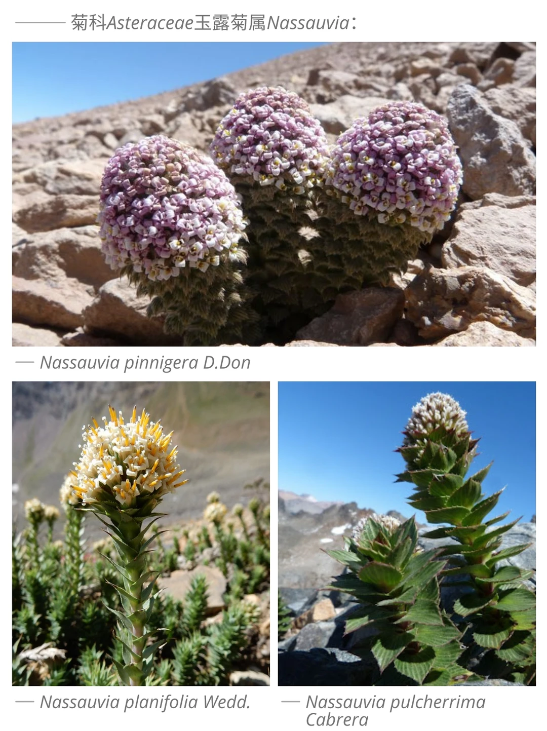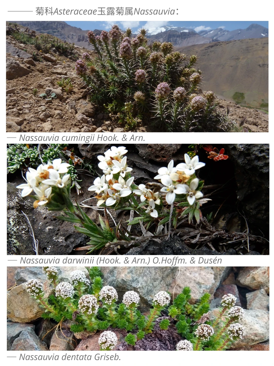 玉露菊属Nassauvia,约有40种小型常绿多年生植物,分布于玻利维亚南部至火地岛和福克兰群岛。它们为矮小灌木或丛生多年生植物,通常由密集生长的新枝或叶丛组成。无柄的革质叶片可能为全缘、锯齿状或简单裂片,常呈针状或刺尖,或饰有独特的棱脊与凹槽图案。花序通常为白色、乳白色或象牙色,内含少数管状小花,每朵小花具两唇,内唇分裂并反卷,外唇为三裂的放射状。部分物种具有小型单生花序,可为顶生或腋生,但大多数情况下花序聚集成簇或球状,或形成单一大型顶生花序(球形至圆柱形,有时极为壮观),或沿上部茎腋部分散排列。花序的聚合方式是识别该类植物的重要初始依据。五种灌木状植物的种子呈绒毛状,而其余种类的种子则扁平、光滑、有光泽且颜色较深,极易让人联想到跳蚤!所有物种在野外均于夏季开花,部分物种花期较晚。