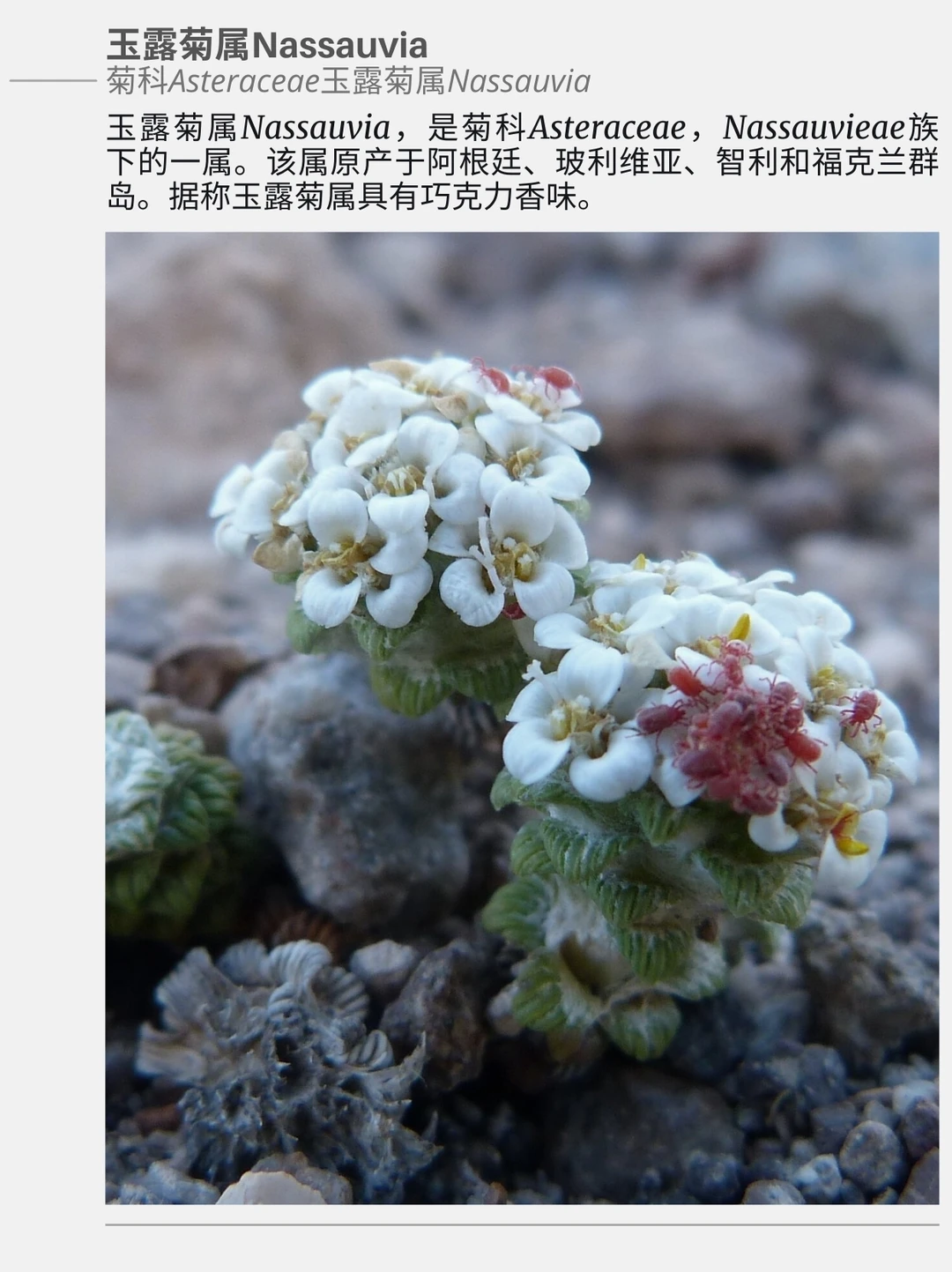 菊科 玉露菊属 Nassauvia 巧克力 山野草 阿根廷 玉露菊属Nassauvia,是菊科Asteraceae,Nassauvieae族下的一属。该属原产于阿根廷、玻利维亚、智利和福克兰群岛。据称玉露菊属具有巧克力香味。
