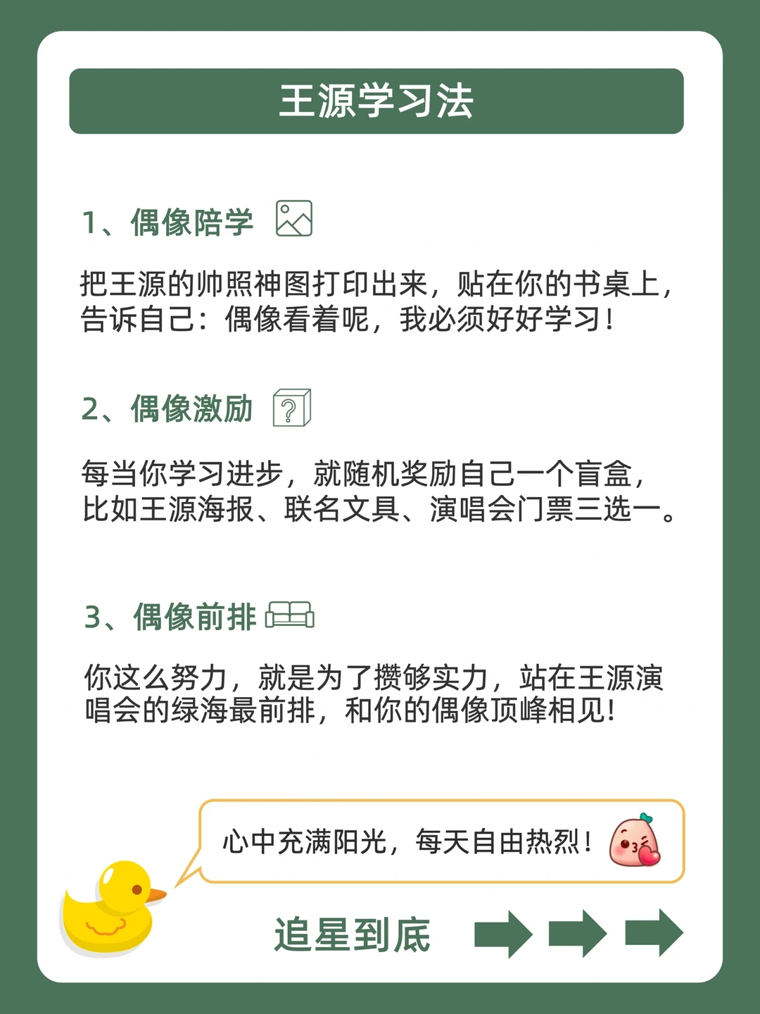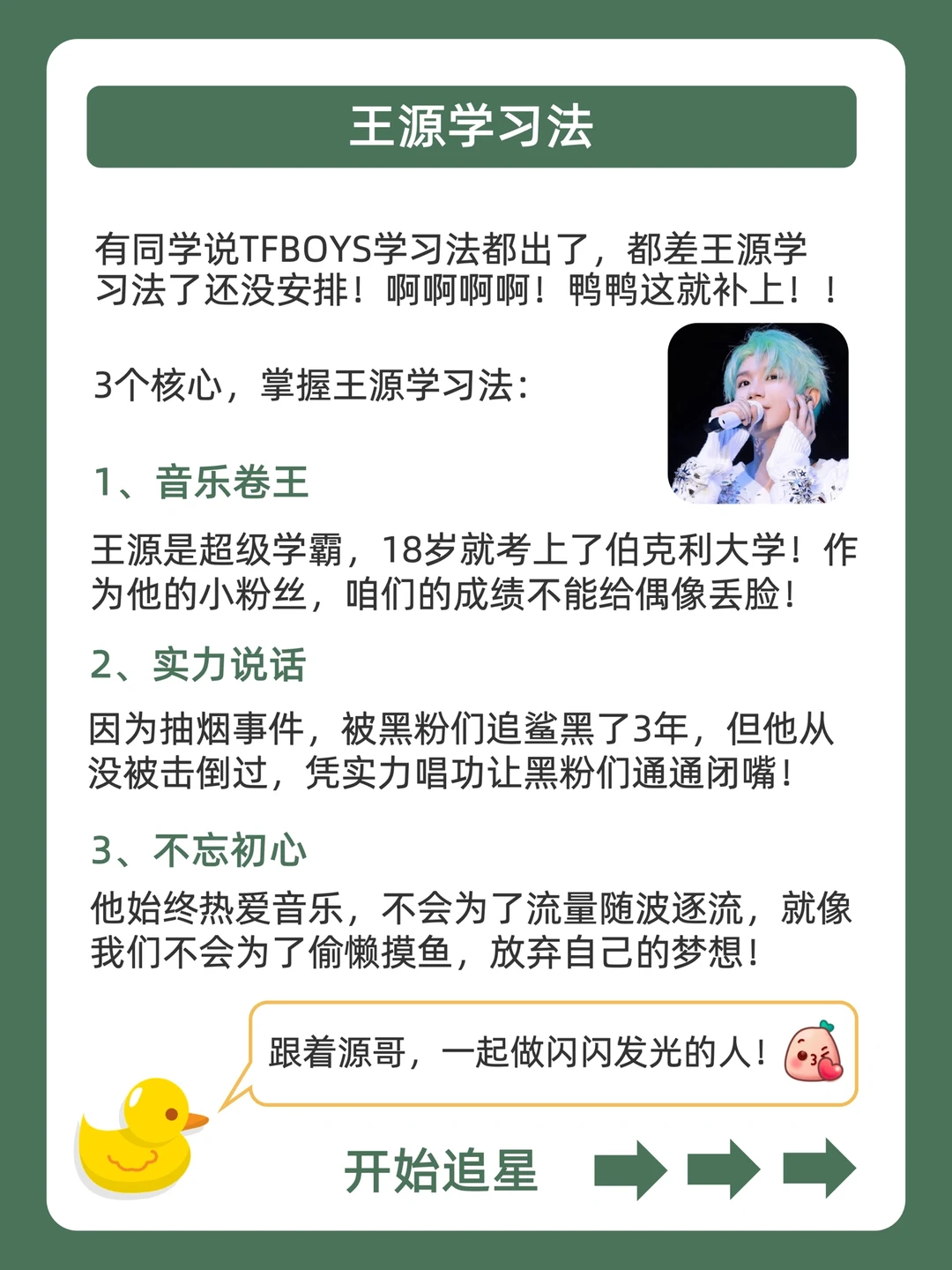 . [赞R]用学习方法帮你变成学霸,是鸭鸭的责任❗ . [向右R]好多宝子说TFBOYS都出了,唯独不见王源学习法的身影![石化R] . [点赞R]鸭鸭这么宠粉,投稿和建议都会认真对待的哇![哇R] . 今天就来分享,王源学习法,都在上面的图,看完就会用,从此追星学习,轻松逆袭![赞R] . 🐣我是鸭鸭,持续更新神奇学习方法,陪宝子们快乐逆袭,驰骋学海!🌊