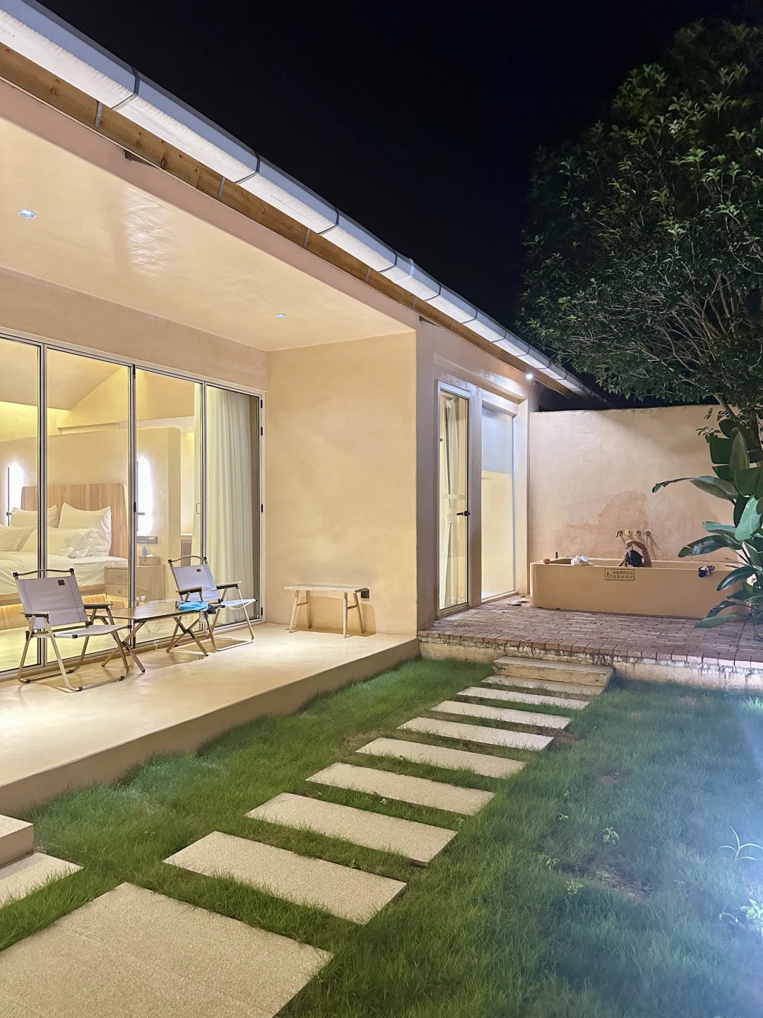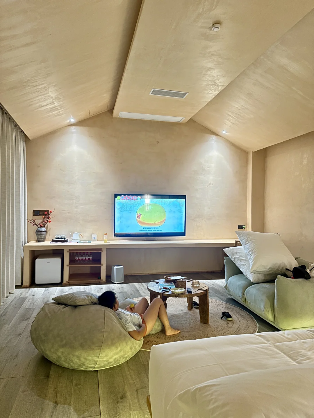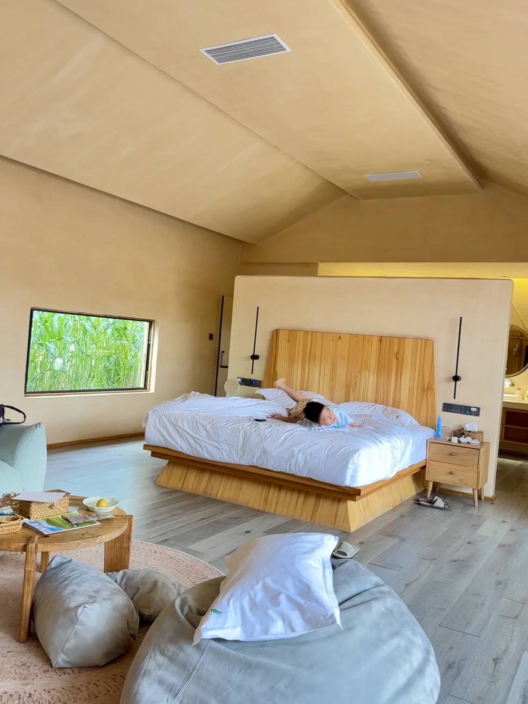 回到房间接着泡汤,房间里隔窗可看到外面的玉米地,电视和床离得老远,小朋友实现看电视自由,住着很舒适。