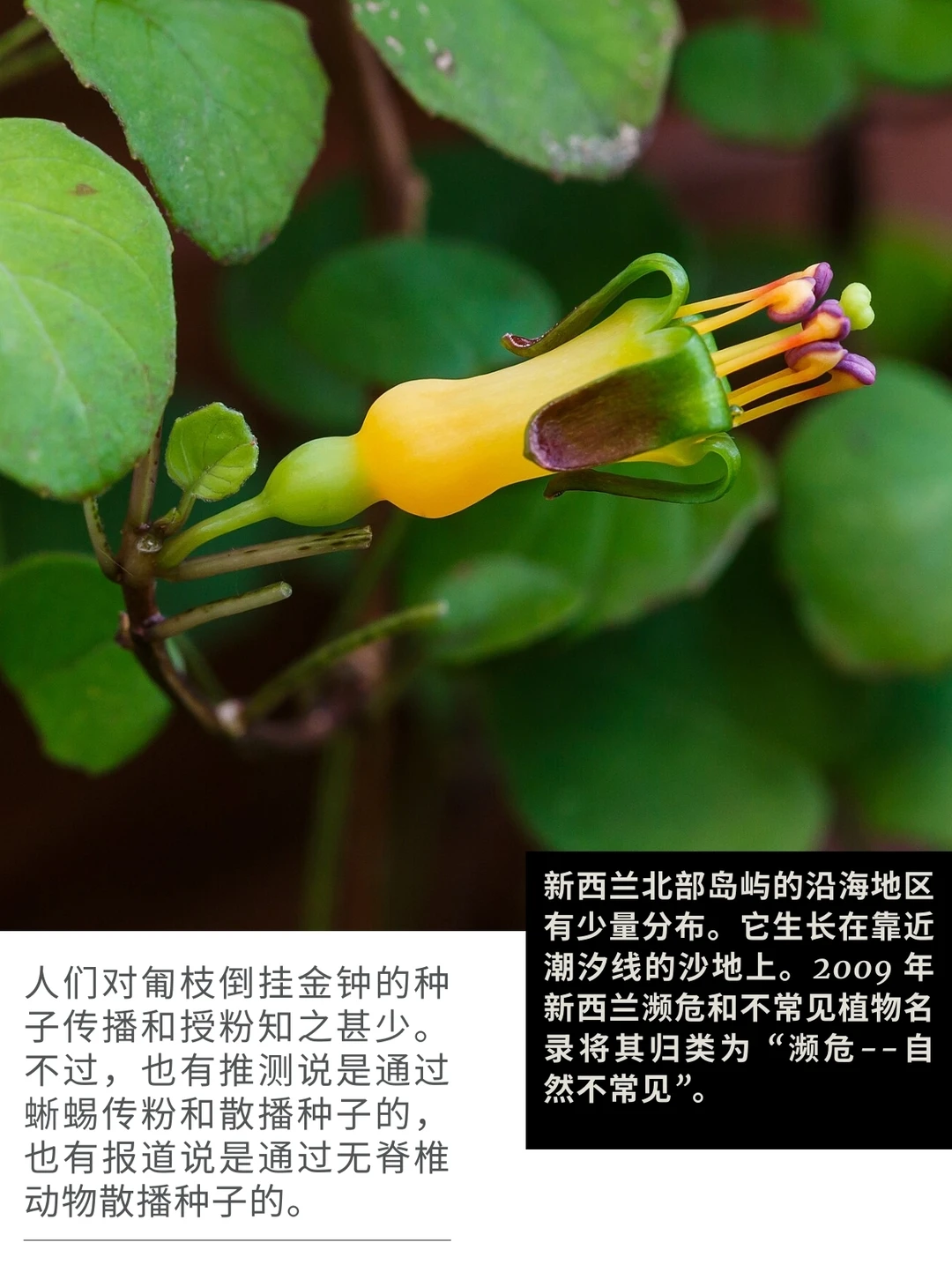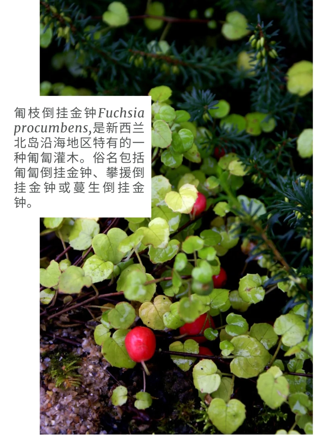 盆栽 花园植物 倒挂金钟 匍枝倒挂金钟 Fuchsia procumbens 新西兰 匍匐灌木 食用 水果 花园 匍枝倒挂金钟Fuchsia procumbens,是新西兰北岛沿海地区特有的一种匍匐灌木。俗名包括匍匐倒挂金钟、攀援倒挂金钟或蔓生倒挂金钟。 新西兰北部岛屿的沿海地区有少量分布。它生长在靠近潮汐线的沙地上。2009 年新西兰濒危和不常见植物名录将其归类为 “濒危--自然不常见”。 果实小而红、脆,可食用,但很少食用。据描述,这种果实黏糊糊的,味道很淡。它通常在花园中种植。