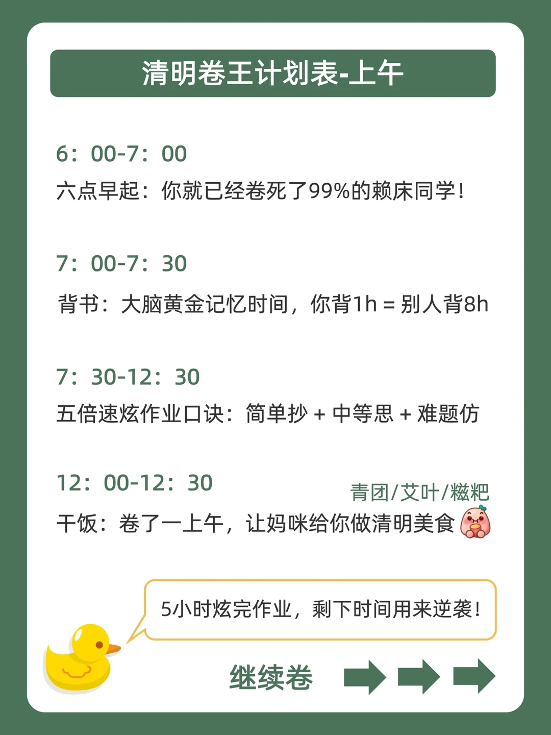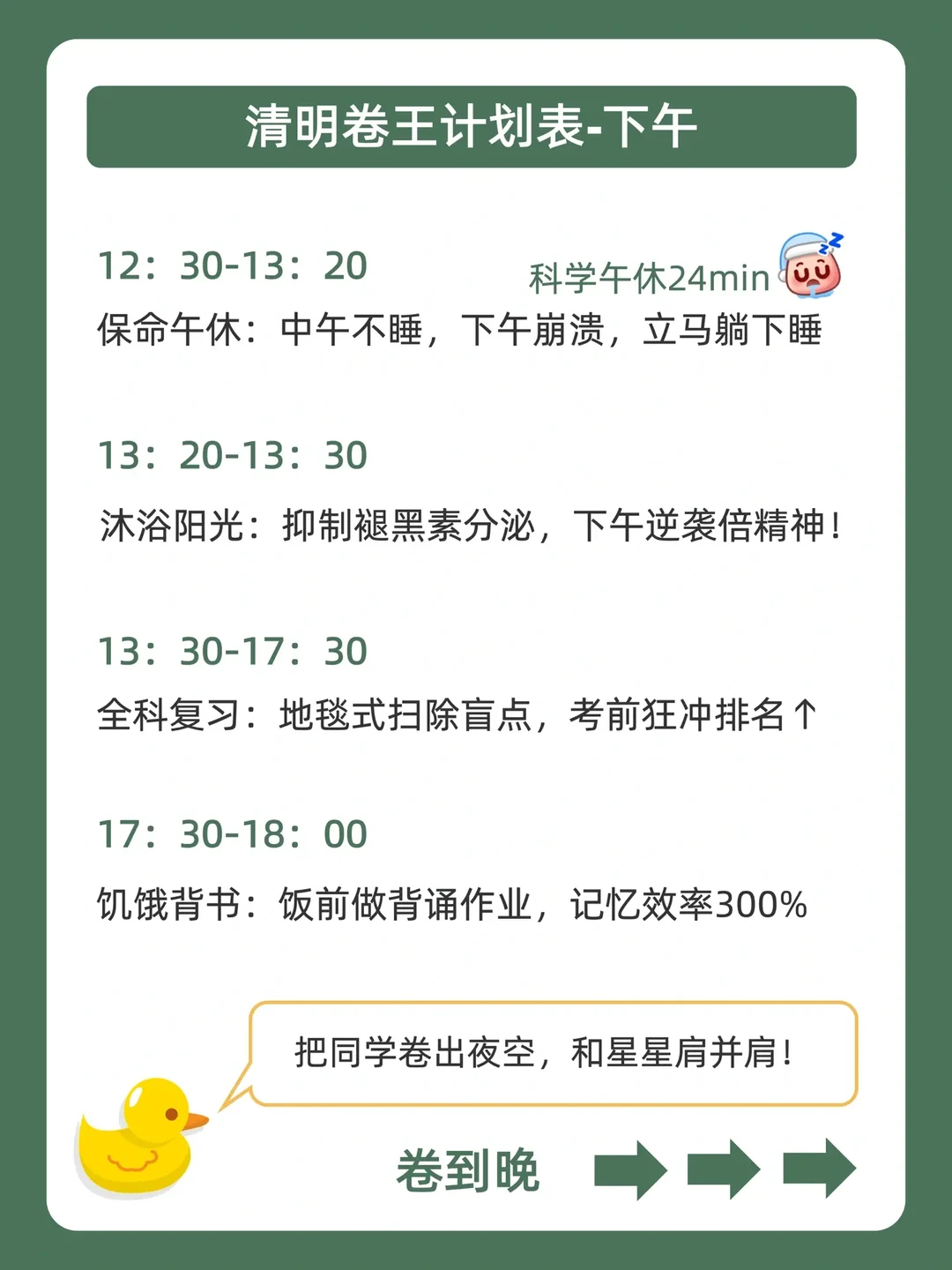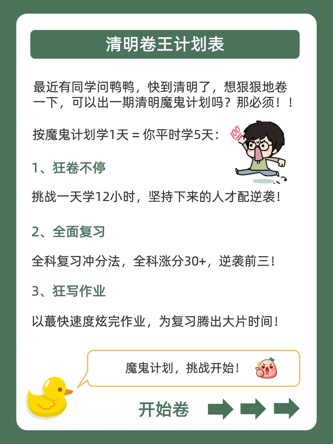. [赞R]学习摆烂不用怕,鸭鸭带你做学霸❗ . [向右R]好多宝子说清明假期也想偷偷卷哭同学![石化R] . [点赞R]鸭鸭这么宠粉,投稿和建议都会认真对待哒![哇R] . 今天就来分享,清明卷王计划表,都在上面的图,看完就能用,从此悄悄内卷,逆袭学霸![赞R] . 🐣我是鸭鸭,持续更新优质学习笔记,陪宝子们疯狂内卷,校园逆袭![赞R]