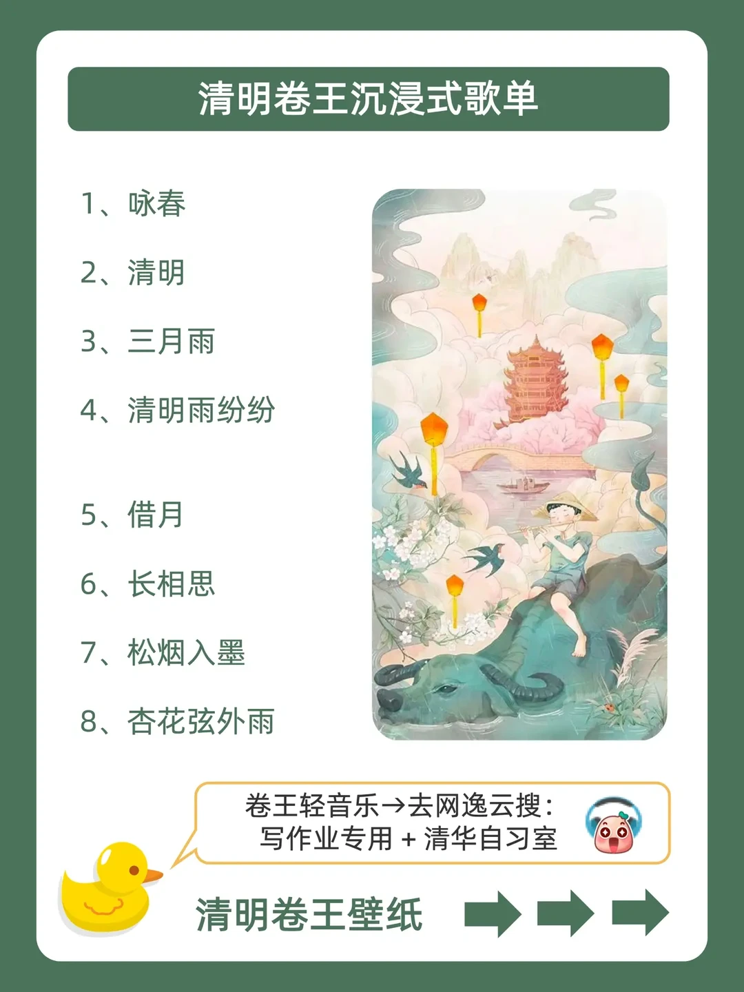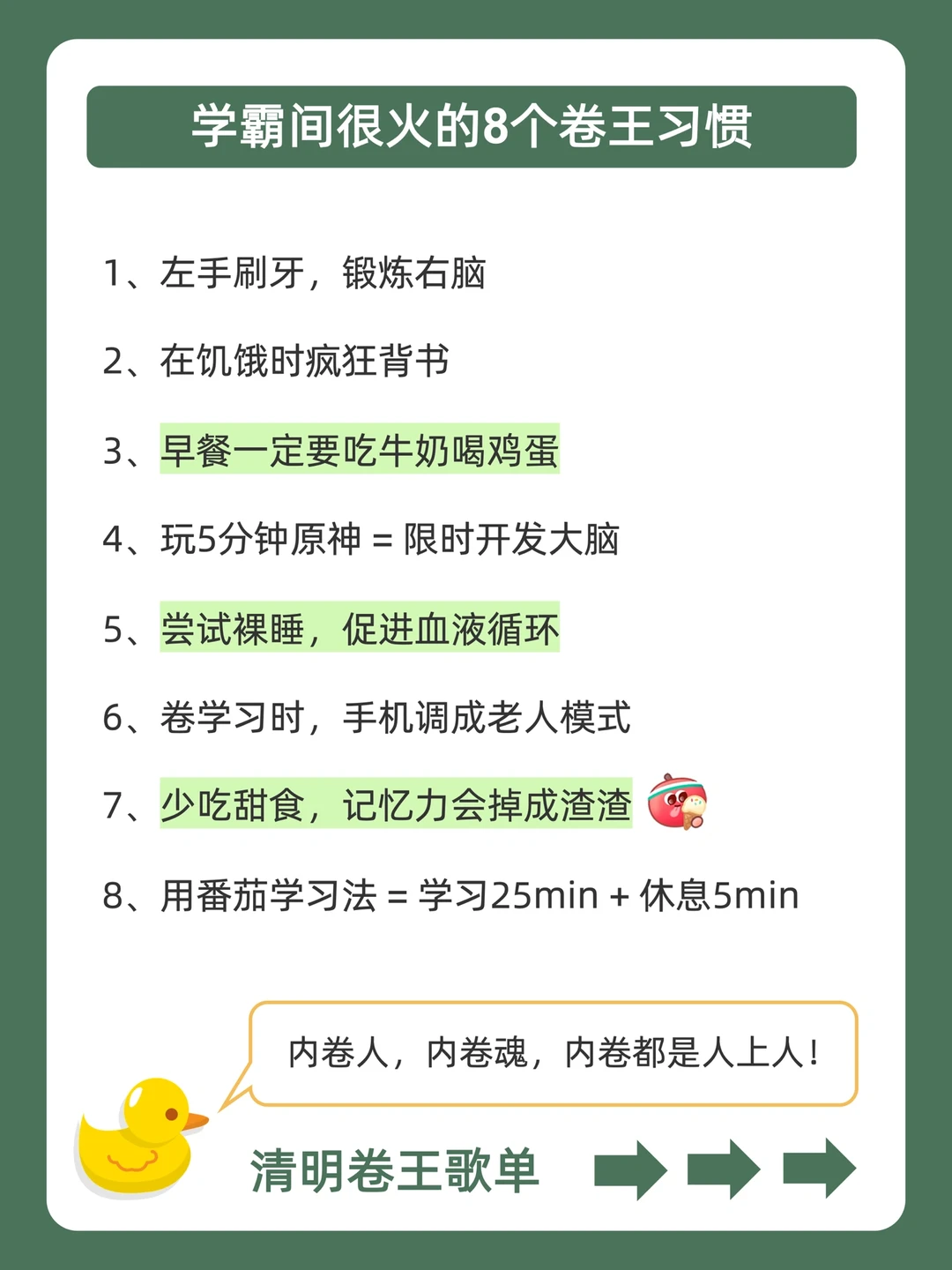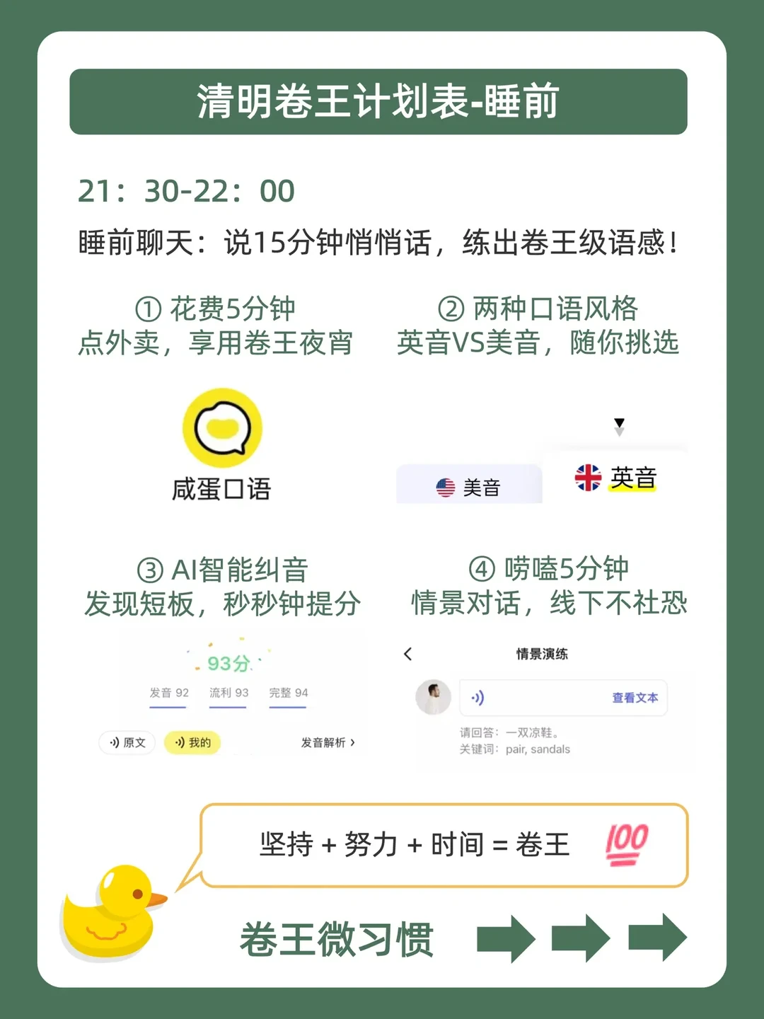 . [赞R]学习摆烂不用怕,鸭鸭带你做学霸❗ . [向右R]好多宝子说清明假期也想偷偷卷哭同学![石化R] . [点赞R]鸭鸭这么宠粉,投稿和建议都会认真对待哒![哇R] . 今天就来分享,清明卷王计划表,都在上面的图,看完就能用,从此悄悄内卷,逆袭学霸![赞R] . 🐣我是鸭鸭,持续更新优质学习笔记,陪宝子们疯狂内卷,校园逆袭![赞R]