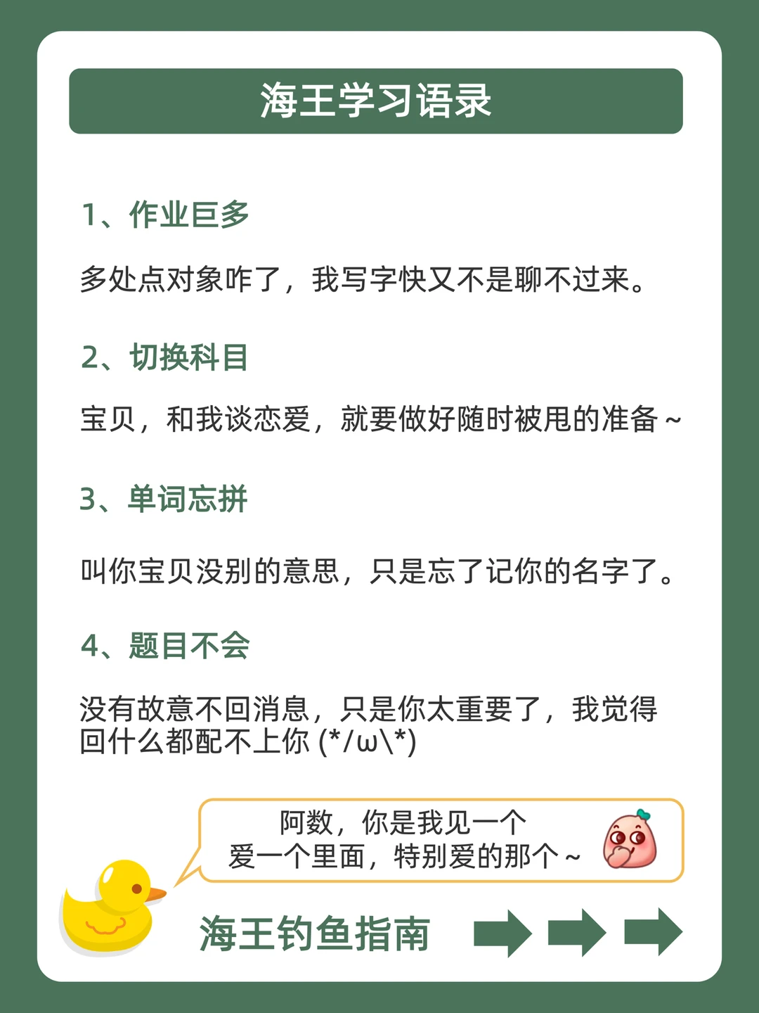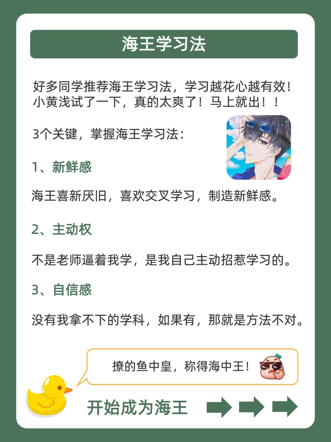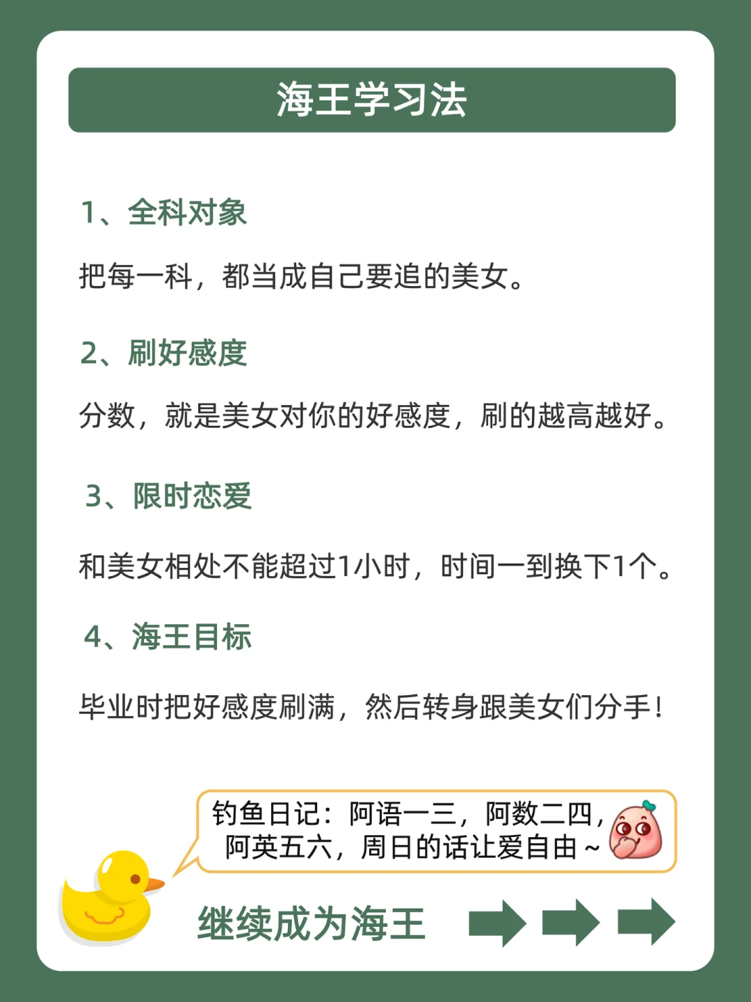 . [赞R]学习摆烂不用怕,鸭鸭带你做学霸❗ . [向右R]有宝子说学习好枯燥乏味,就是学不进去![石化R] . [点赞R]那怎么能行!鸭鸭立马安排有趣的学习方法![哇R] . 今天就来分享,原创自的海王学习法,都在上面的图,看完就会用!从此雨露均沾,偏科拜拜!👋 . 🐣我是鸭鸭,持续更新幽默学习笔记,陪宝子们疯狂内卷,校园逆袭![赞R]