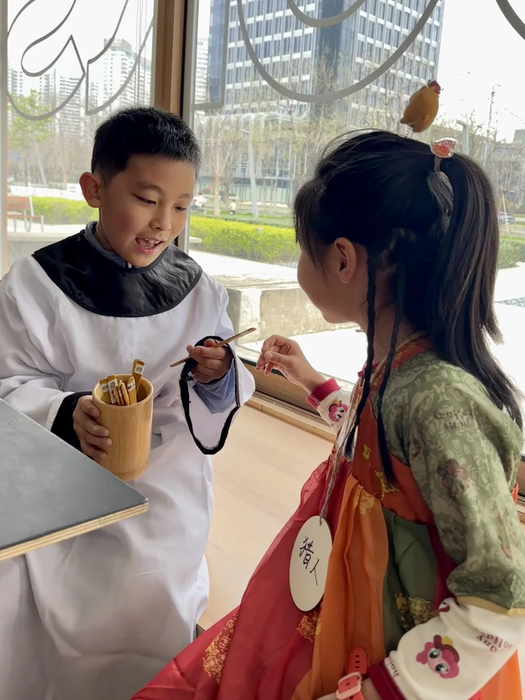 💡唐朝进城要写什么?怎样打工挣钱?答案全在游戏里!\n复旦博士带队🔥穿越到盛唐,长安奇遇之旅~\n复旦博士超会讲!把枯燥历史变成超有趣故事\u00a0!\n穿越到唐朝当\"新市民\"!✨体验一秒变唐人!\n亲手用毛笔写\"通关证\"(公验)\ncosplay长安城打工人,8种酷炫职业抽签——✔️帅气的金吾卫、✔️仙气飘飘的道长、✔️美美哒胡姬...娃们玩着玩着就涨知识啦\n孩子们边\"打工\"边学古代经济学,能力值蹭蹭涨📈\n👶🏻娃们玩疯啦!边玩边学历史知识\u00a0\u00a0📚