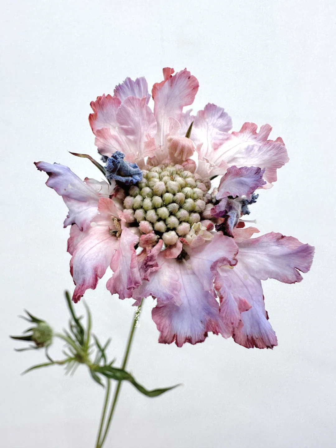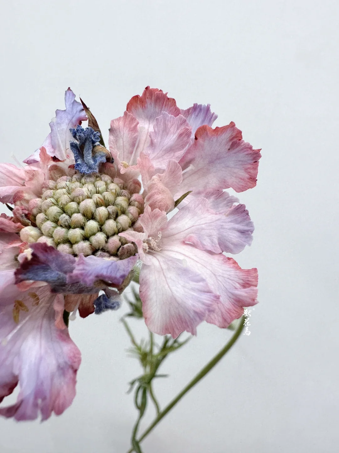 花材:蓝盆花 别名:轮峰菊 花期:鲜切花7-10天 花语:追忆、梦想、无法实现的爱情 花瓣舒展,且边缘呈不规则锯齿状,吸色后会呈现不均匀的颜色,非常独特。 养护 开放后在运输途中容易受伤,需谨慎挑选,以免在运输过程中损伤 1⃣️换水:每2-3日一次 2⃣️清洗:花瓶清洗干净,擦掉水渍,花杆剪根冲洗 3⃣️水位:花瓶高度1/3,草本植物,浅水位 4⃣️修剪:根部以上2~3cm处45°斜剪 🌈|TIPS|长按自取|感谢喜欢|欢迎分享