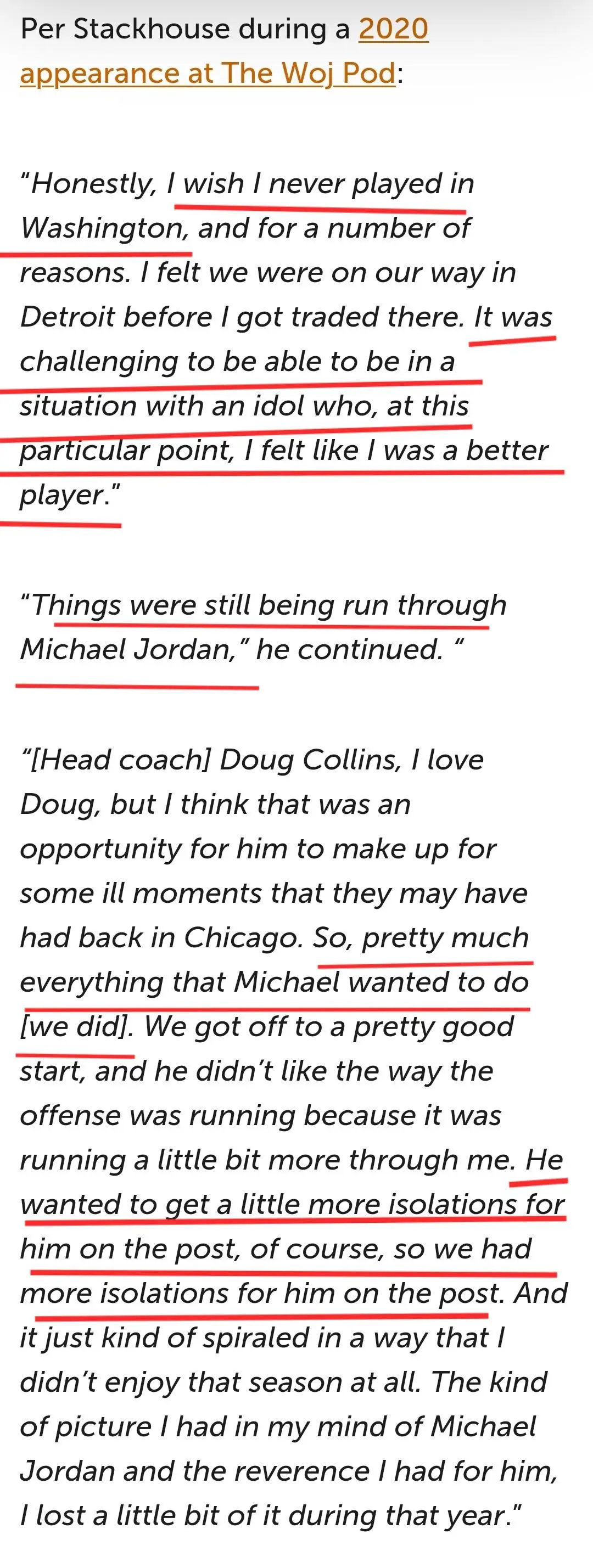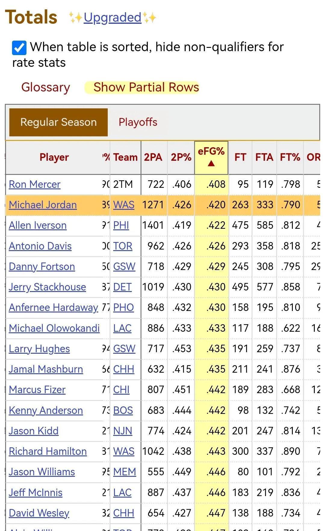 “乔丹前队友:和乔丹当队友,让我不想尊重他了”40岁的迈克尔乔丹在华盛顿奇才队是球队小老板并兼职篮球运营主席(掌权了球队的选秀和交易)。迈克尔乔丹亲手挑选夸梅布朗,迈克尔乔丹亲自交易了理查德汉密尔顿换来杰里斯塔克豪斯,前者于02-03年效力于奇才然后在03-04为活塞带来了总冠军,而后者(杰里·斯塔克豪斯)表态:“很后悔效力于奇才,真希望我没在那里打过球。我在活塞打的很好我们球队状态士气都很棒,虽然我的偶像是乔丹但是和他一起打球充满挑战,一切都是他说了算,教练是他雇来的前公牛队的教练,他说要多单打我们就给他多传球单打。他说什么我们就做什么我们没得选,我对他的尊重…在那些日子没了一些尊重。”。在奇才的两年里乔丹看似可以带来进攻方面的贡献但这两年里他的有效命中率低到了倒数的程度,第一年排在联盟倒数第二,第二年排在倒数第十五意味着乔丹的得分是依靠疯狂出手、滥用无限开火权的结果,而非球商和篮球技术的高效产物。反观勒布朗-詹姆斯从投射是缺点到昨天以3中2的三分超越雷吉米勒,不贪球权不贪出手不做球霸,更全面的球员不仅仅可以用得分来帮助球队还可以用其他方式帮助球队。