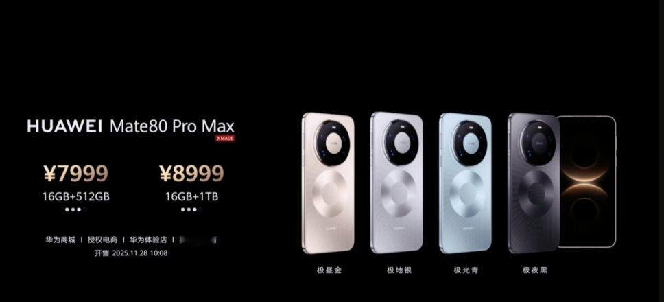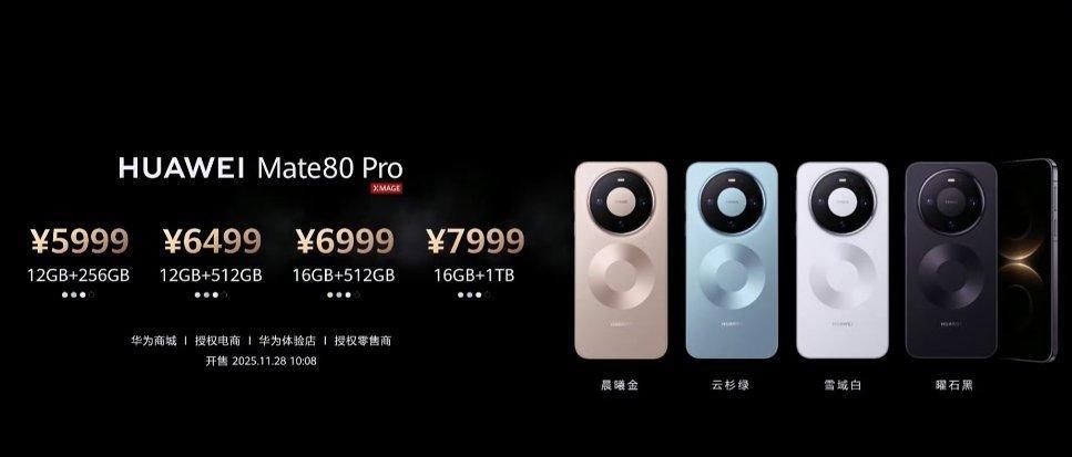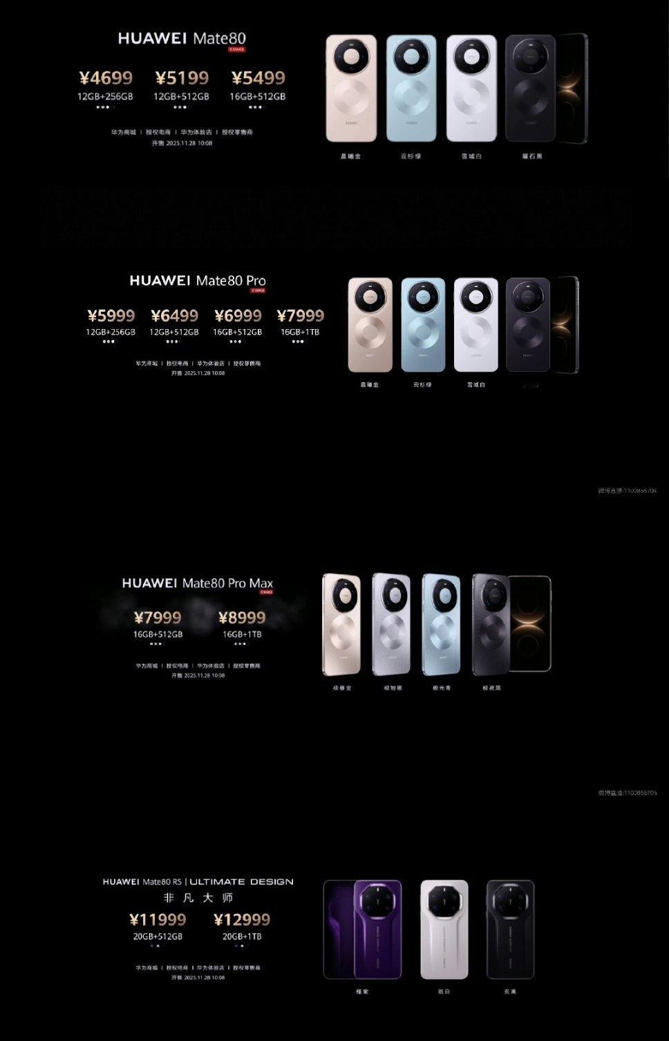 华为Mate80系列价格来了!华为Mate80 12+256GB 4699元起!华为Mate80 Pro 12+256GB 5999元起!华为Mate80 Pro Max 16+512GB 7999元起!华为Mate80 RS非凡大师 20+512GB 11999元起!相比于上代华为Mate70系列,有的是加量不加价,甚至还降了不少!