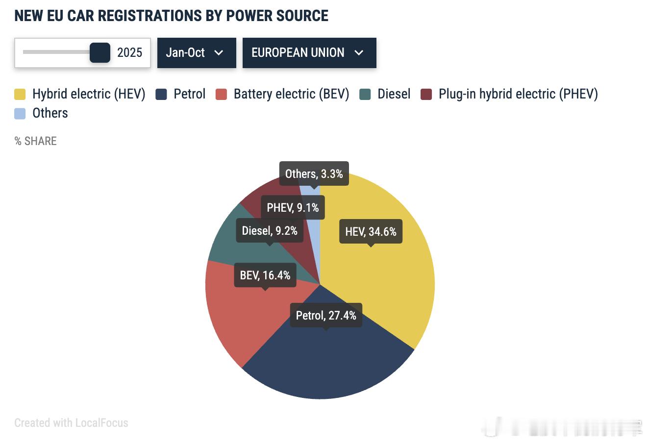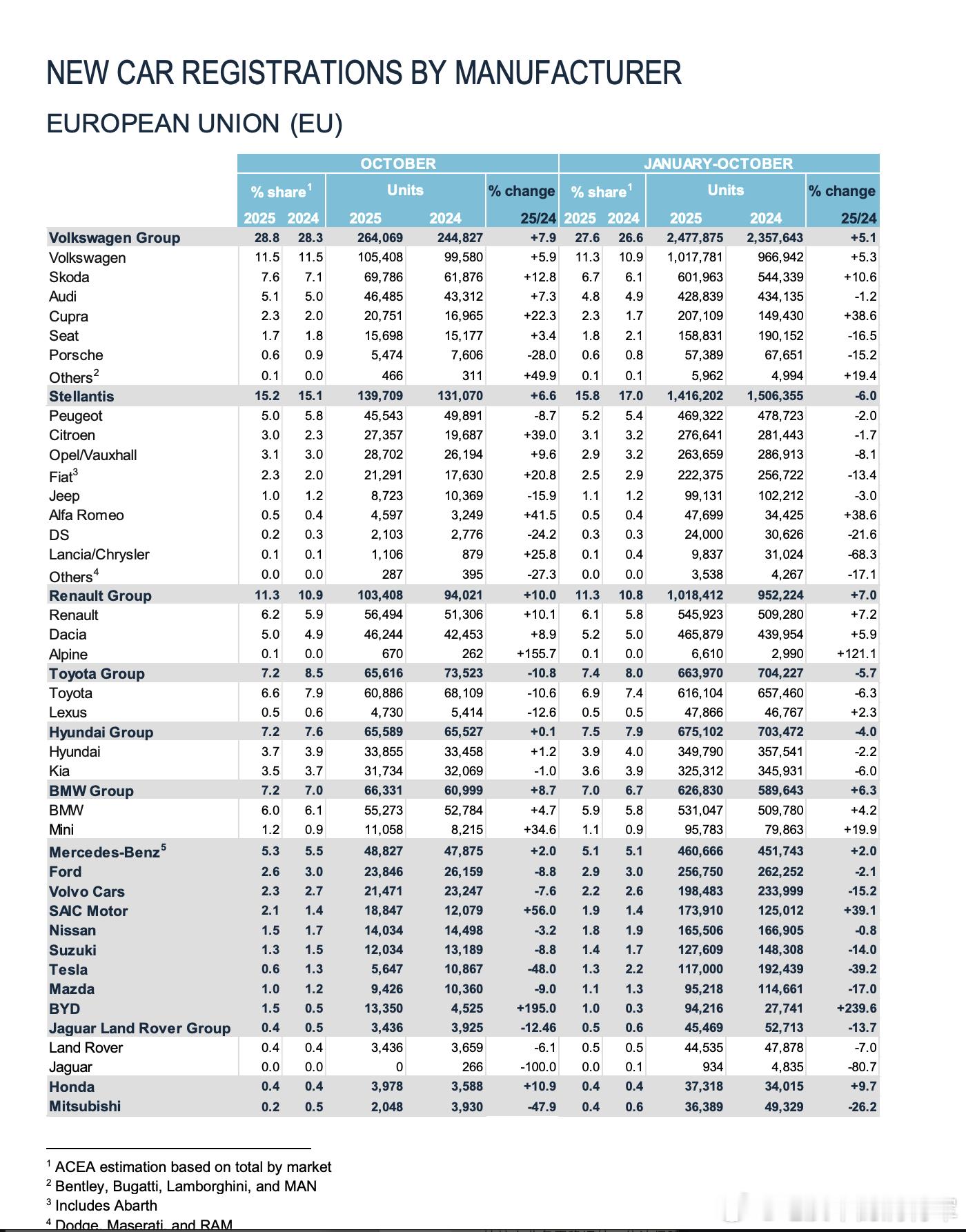 各位好,10月欧洲的详细销量统计出炉,10月的销量同比上涨5.8%,连续第四个月出现正增长。而1-10月的累计销量也继续增长,增长了0.9%。⭕销量情况:根据欧盟汽车工业协会(ACEA)的统计,欧盟10月新车登记上牌数量为91.7万辆,同比去年上涨5.8%。10月的欧洲市场跟9月一样,销量连续第四个月出现增长,随着10月销量的继续增长,欧洲上1-10月的累计销量实现了正增长,增幅为1.4%,欧洲的汽车销量终于摆脱了今年上半年的颓势,开始慢慢的复苏 。(图一)⭕新能源渗透率:10月欧洲新能源渗透率达到了29.4%,其中纯电占比18.9%,插混占比10.5%。相比9月的渗透率上涨0.2%10月纯电渗透率环比9月持平,插混环比9月上涨了0.2%。10月欧洲纯电车型销量(上险量)达到了17.3万辆,环比9月的16.8万增长3.16%,同比也增长 38.6%。在 2025 年前10个月,共有 1,473,447 辆新电池电动车注册,占欧盟市场份额的 16.4%。欧盟四个最大市场(合计占电池电动车注册量的 62%)均有所增长:德国(+39.4%)、比利时(+10.6%)、荷兰(+6.6%)和法国(+5.3%)。从销量情况可以看出,欧洲厂的纯电销量开始趋于稳定,已经到达尝鲜用户和主流用户的分界点了,所以欧洲厂家现在都在寻找适合自己的纯电车型,尤其是小型车。这也解释了为啥Stellantis和雷诺纷纷寻找国内厂家的纯电车型并在欧洲进行投放。但是插混的销量在大幅增加,10月欧洲插混车型的上险量为9.6万辆,录得连续第八个月的增长,同比增幅为 43.2%。2025 年1-10月,PHEV车型登记量达到 819,201 辆。这主要由关键市场的数量增长推动,如西班牙(+109.6%)、意大利(+76.5%)和德国(+63.4%)。因此,插电式混合动力汽车现在占欧盟新车登记的 9.1%,较 2024 年 10月同期的 7%有所上升。⭕燃油车的市销量不容乐观。10月的燃油车(包含汽油和柴油车)销量为30.2万辆,比9月的29.3万辆增长了0.9万辆,但是市占率仅为32.9%,环比9下降了0.1%,但是低于 2024 年同期的 40%。汽油车同比下降了 14.3%,柴油车同比下降了 21.9%,目前看来欧洲的燃油车基本上是呈现下降态势,对于目前的正在转型的厂家来说不是好事情。⭕10月HEV车型的销量依然持续爆发,也就是国内俗称的油混,10月HEV车型的销量为31.6万辆,同比增长 9.4%,但是市占率也从从9月的34.7%下降了0.2个百分点到34.5%。2025 年 1 至 10 月的数据显示,欧盟新增HEV车型注册量也上升至 3,109,362 辆,这一增长主要由四个最大市场推动:西班牙(+27.1%)、法国(+26.3%)、德国(+10.3%)和意大利(+8.9%)。HEV车型占欧盟整体市场的 34.6%。HEV车型在欧洲大卖,说明欧洲人对HEV真的是如饥似渴的。考虑到HEV在海外主打的省油方向,国内的插混尤其是小电池插混是有降维打击的机会的。现在国内很多插混车型都可以做到综合油耗3L左右,海外主打这个卖点是完全可以吸引到用户的。⭕我们再来看看品牌的情况,10月的销量情况都是明显向好。大家熟悉的品牌情况如下:大众大涨7.9%,Stellantis上涨了6.6%,雷诺大涨10%,宝马大涨了8.7%,奔驰上涨2%, 现代上涨0.1%,丰田大幅下降10.8%,特斯拉大跌48%。比亚迪的销量则激增 195%。整体来看,欧洲本土品牌走到了十字路口,现在新能源取得了一定的成绩,但是未来要继续扩张受制于产品和研发能力。所以现在有一些欧洲品牌已经开始在和中国的厂家合作,采取两条腿走路的方式,看看哪个方式能成功。同时国内品牌在欧洲的攻城略地有了一些初步成效,后续如何发展还是取决于中欧关税谈判的结果。国内品牌在欧洲的拓展还是很有亮点的,只要肯坚持投入,还是能等来雨过天晴的。
