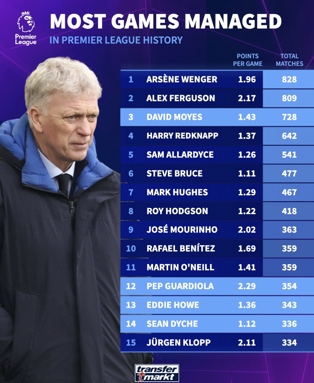 温格以828场居首,弗格森以809场排名第二。莫耶斯以728场排名第三,依旧保持着冲击榜单前二的机会。