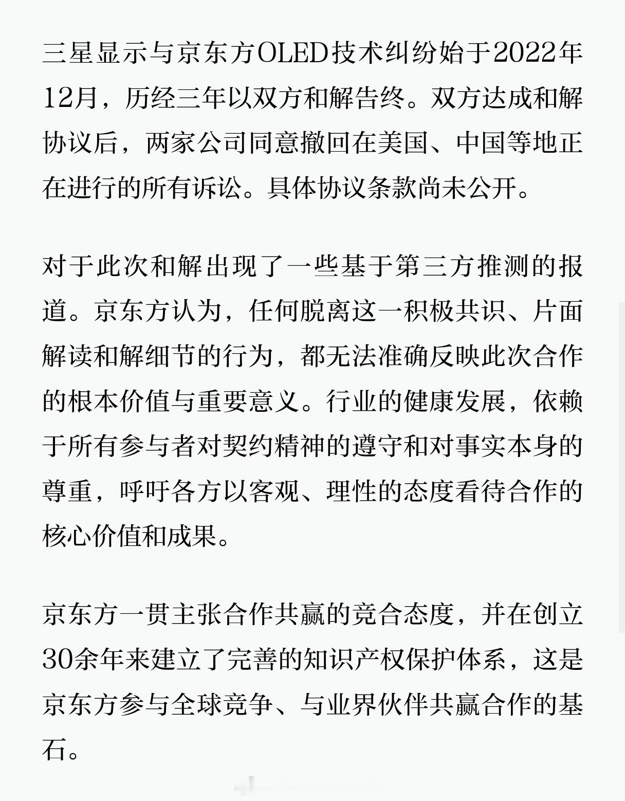 旷日持久的三星和京东方的专利诉讼案前段时间终于尘埃落定:京东方(BOE)与三星显示(Samsung Display)已就显示领域知识产权争议达成和解,并共同向美国国际贸易委员会(ITC)提交申请终止并撤销 337 调查;同时将尽快撤销双方之间的其他关联案件。而实际上三星赢得了这场专利争端,京东方同意支付专利使用费,结束近三年的专利和商业秘密纠纷。据韩联社披露,双方和解的最后结果是京东方向三星支付 1 万亿韩元左右(约合 48.51 亿人民币)的专利使用费,而三星最初提出的是 2 万亿韩元。